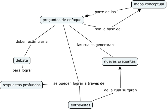 Este Cmap, tiene información relacionada con: preguntas, preguntas de enfoque deben estimular al debate, respuestas profundas se pueden lograr a traves de entrevistas, preguntas de enfoque son la base del mapa conceptual, mapa conceptual parte de las preguntas de enfoque, debate para lograr respuestas profundas, preguntas de enfoque se pueden lograr a traves de entrevistas, entrevistas de la cual surgiran nuevas preguntas, preguntas de enfoque las cuales generaran nuevas preguntas