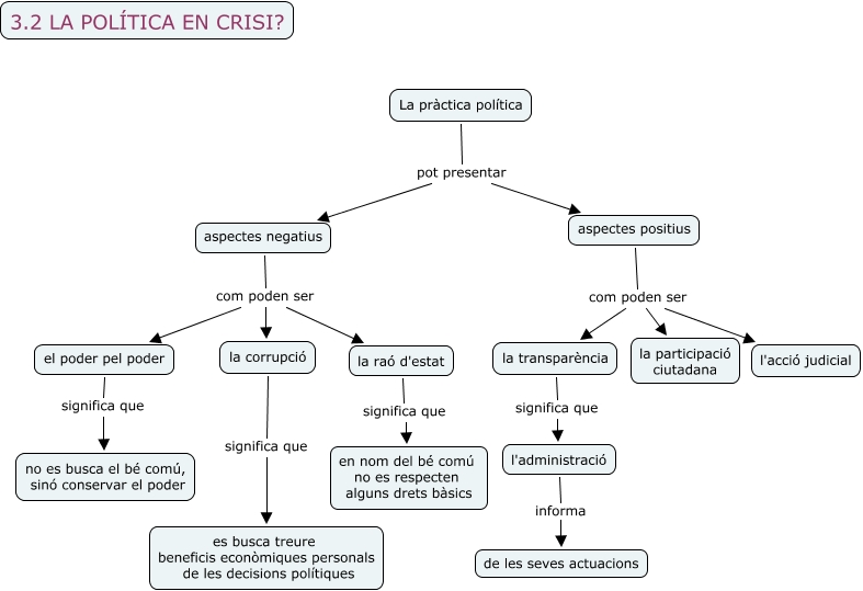 Aquest mapa conceptual conté informació relacionada amb: 3.2 La política en crisi, aspectes positius com poden ser la transparència, aspectes negatius com poden ser la corrupció, el poder pel poder significa que no es busca el bé comú, sinó conservar el poder, aspectes positius com poden ser la participació ciutadana, la corrupció significa que es busca treure beneficis econòmiques personals de les decisions polítiques, aspectes positius com poden ser l'acció judicial, la transparència significa que l'administració, La pràctica política pot presentar aspectes positius, aspectes negatius com poden ser el poder pel poder, aspectes negatius com poden ser la raó d'estat, La pràctica política pot presentar aspectes negatius, l'administració informa de les seves actuacions, la raó d'estat significa que en nom del bé comú no es respecten alguns drets bàsics