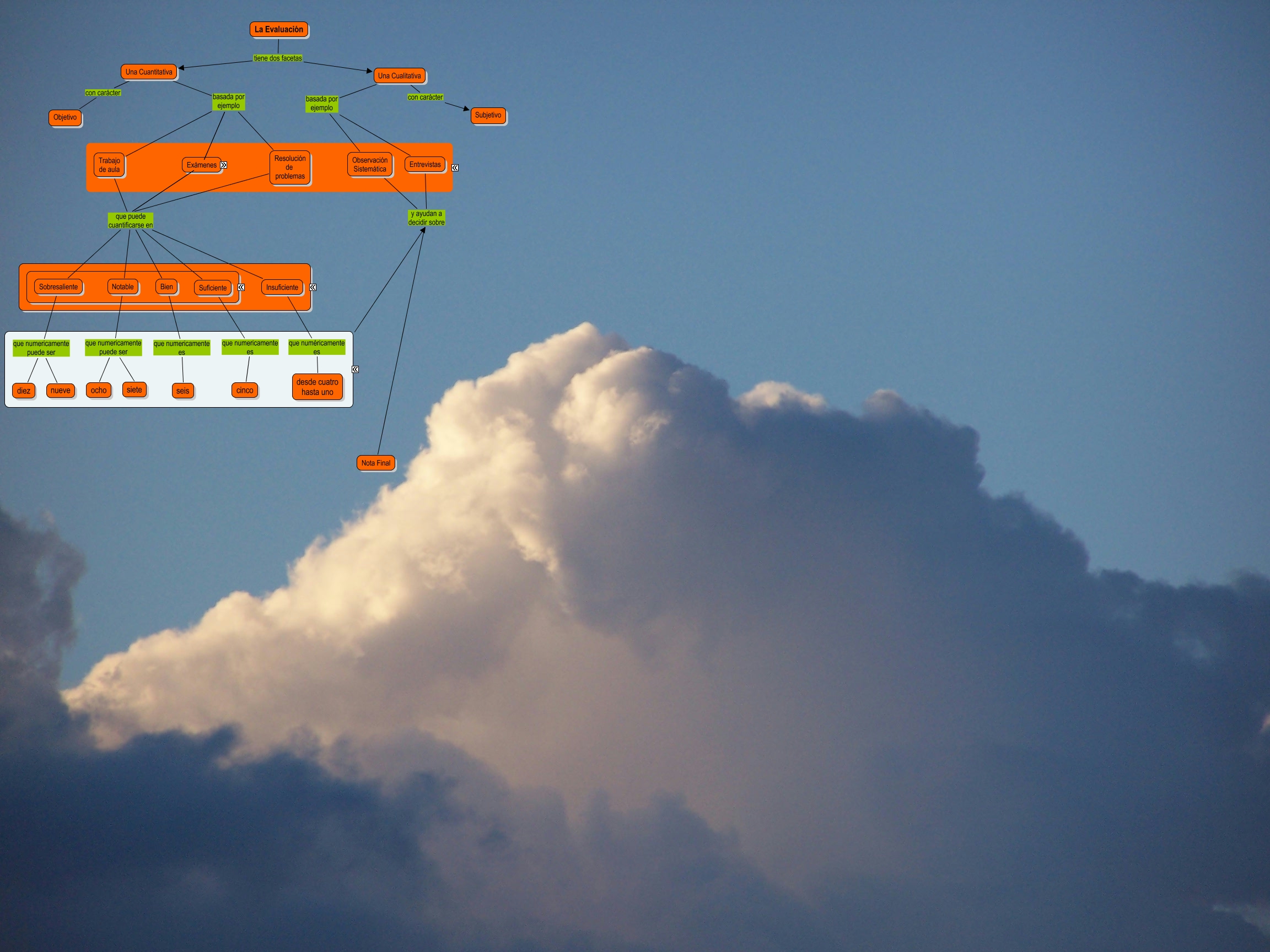 Este Cmap, tiene información relacionada con: tarea6.1, Una Cualitativa basada por ejemplo Observación Sistemática, Pruebas escritas que puede cuantificarse en Suficiente, La Evaluación tiene dos facetas Una Cualitativa, Una Cualitativa basada por ejemplo Entrevistas, Trabajo de aula que puede cuantificarse en Notable, Valores Numéricos y ayudan a decidir sobre Nota Final, Una Cuantitativa basada por ejemplo Trabajo de aula, Resolución de problemas que puede cuantificarse en Notable, Pruebas orales que puede cuantificarse en Bien, Pruebas escritas que puede cuantificarse en Sobresaliente, Entrevistas y ayudan a decidir sobre Nota Final, Pruebas orales que puede cuantificarse en Sobresaliente, Trabajo de aula que puede cuantificarse en Sobresaliente, Resolución de problemas que puede cuantificarse en Suficiente, Bien que numericamente es seis, Una Cuantitativa basada por ejemplo Pruebas orales, Pruebas escritas que puede cuantificarse en Notable, Suficiente que numericamente es cinco, Notable que numericamente puede ser siete, Resolución de problemas que puede cuantificarse en Sobresaliente