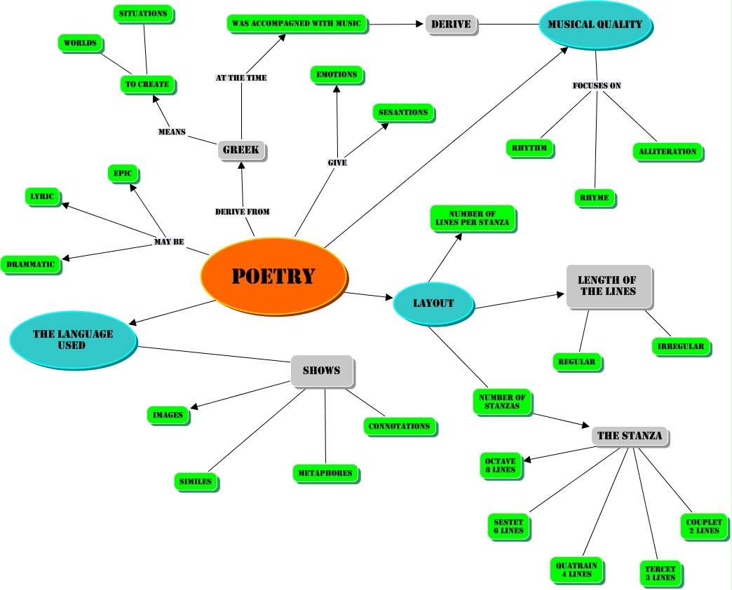 Questa Mappa Concettuale ha informazioni correlate a: Rocchi - Taddei - POETRY, was accompagned with music ???? derive, derive ???? Musical quality, Layout number of lines per stanza, Layout Number of stanzas, Layout Length of the lines, the stanza ???? sestet 6 lines, POETRY may be lyric, the stanza ???? octave 8 lines, Shows Similes, Shows Metaphores, POETRY ???? Musical quality, The language used Shows, POETRY ???? The language used, greek at the time was accompagned with music, greek means To create, POETRY derive from greek, POETRY may be epic, To create ???? Situations, the stanza ???? couplet 2 lines, the stanza ???? quatrain 4 lines