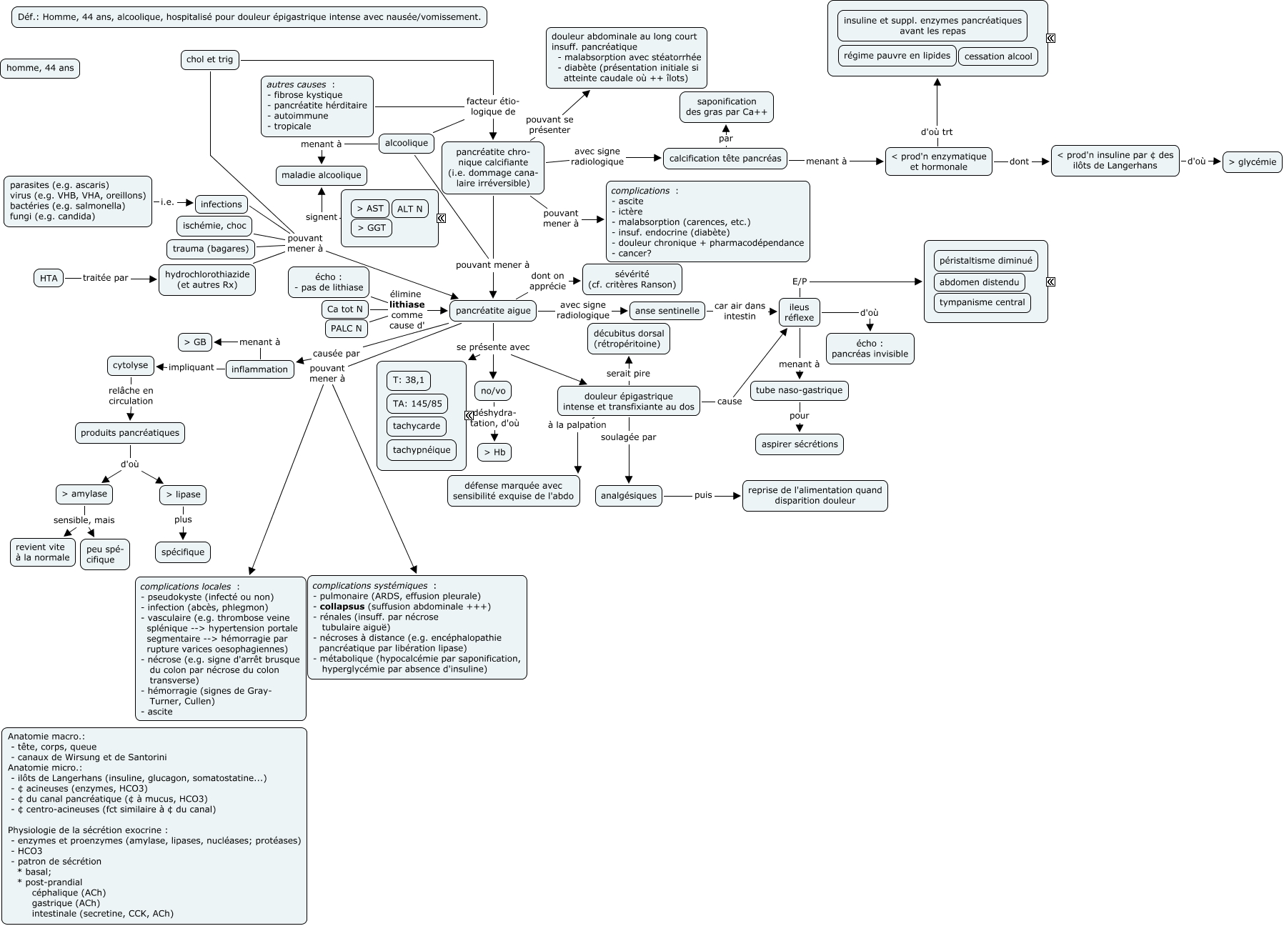 Cette carte conceptuelle, cree avec IHMC CmapTools, contient des informations liees a : app5-aller, pancréatite aigue dont on apprécie sévérité (cf. critères Ranson), PALC N élimine lithiase comme cause d' pancréatite aigue, douleur épigastrique intense et transfixiante au dos soulagée par analgésiques, ileus réflexe E/P ????, cytolyse relâche en circulation produits pancréatiques, pancréatite aigue se présente avec no/vo, douleur épigastrique intense et transfixiante au dos à la palpation défense marquée avec sensibilité exquise de l'abdo, pancréatite aigue avec signe radiologique anse sentinelle, chol et trig pouvant mener à pancréatite aigue, écho : - pas de lithiase élimine lithiase comme cause d' pancréatite aigue, < prod'n enzymatique et hormonale d'où trt ????, > lipase plus spécifique, produits pancréatiques d'où > lipase, douleur épigastrique intense et transfixiante au dos serait pire décubitus dorsal (rétropéritoine), ???? signent maladie alcoolique, ileus réflexe d'où écho : pancréas invisible, parasites (e.g. ascaris) virus (e.g. VHB, VHA, oreillons) bactéries (e.g. salmonella) fungi (e.g. candida) i.e. infections, trauma (bagares) pouvant mener à pancréatite aigue, produits pancréatiques d'où > amylase, inflammation menant à > GB