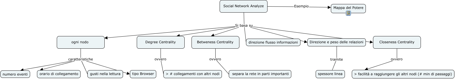 Questa Cmap, creata con IHMC CmapTools, contiene informazioni relative a: MariaLuisaLatini, ogni nodo caratteristiche numero eventi, Social Network Analyze Si basa su Degree Centrality, Social Network Analyze Si basa su ogni nodo, ogni nodo caratteristiche orario di collegamento, Direzione e peso delle relazioni tramite spessore linea, Social Network Analyze Si basa su Direzione e peso delle relazioni, Social Network Analyze Esempio Mappa del Potere, Social Network Analyze Si basa su Closeness Centrality, Social Network Analyze Si basa su Betweness Centrality, ogni nodo caratteristiche gusti nella lettura, Social Network Analyze Si basa su direzione flusso informazioni, Betweness Centrality ovvero separa la rete in parti importanti, Closeness Centrality ovvero > facilità a raggiungere gli altri nodi (# min di passaggi), Degree Centrality ovvero > # collegamenti con altri nodi, ogni nodo caratteristiche tipo Browser