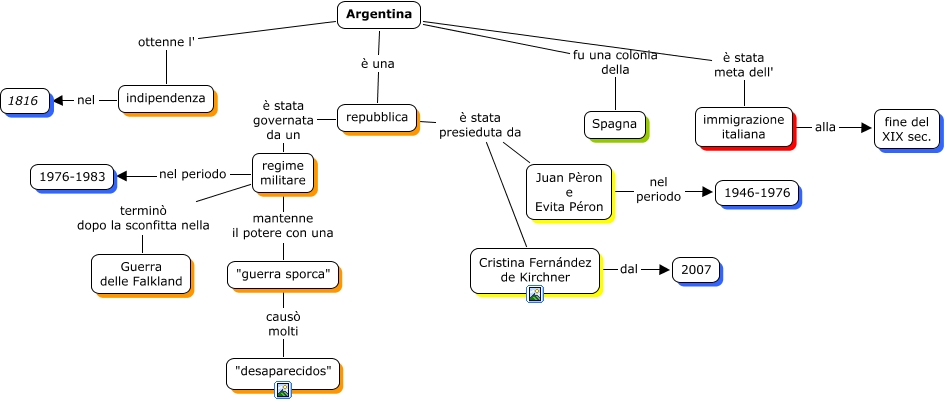 Questa Cmap, creata con IHMC CmapTools, contiene informazioni relative a: 364) Argentina - storia, repubblica è stata governata da un regime militare, "guerra sporca" causò molti "desaparecidos", immigrazione italiana alla fine del XIX sec., Juan Pèron e Evita Péron nel periodo 1946-1976, repubblica è stata presieduta da Cristina Fernández de Kirchner, regime militare terminò dopo la sconfitta nella Guerra delle Falkland, Argentina è stata meta dell' immigrazione italiana, Argentina fu una colonia della Spagna, Argentina ottenne l' indipendenza, repubblica è stata presieduta da Juan Pèron e Evita Péron, Cristina Fernández de Kirchner dal 2007, regime militare nel periodo 1976-1983, Argentina è una repubblica, indipendenza nel 1816, regime militare mantenne il potere con una "guerra sporca"