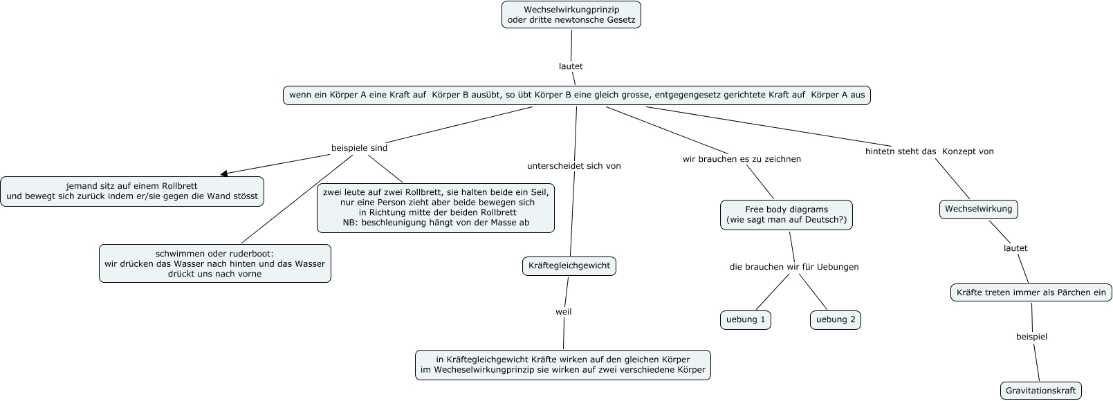 Dieses mit IHMC CmapTools erstellte CMap hat Informationen bezüglich: Dritte Newtonsche Gesetz, wenn ein Körper A eine Kraft auf Körper B ausübt, so übt Körper B eine gleich grosse, entgegengesetz gerichtete Kraft auf Körper A aus unterscheidet sich von Kräftegleichgewicht, Wechselwirkung lautet Kräfte treten immer als Pärchen ein, Kräftegleichgewicht weil in Kräftegleichgewicht Kräfte wirken auf den gleichen Körper im Wecheselwirkungprinzip sie wirken auf zwei verschiedene Körper, Wechselwirkungprinzip oder dritte newtonsche Gesetz lautet wenn ein Körper A eine Kraft auf Körper B ausübt, so übt Körper B eine gleich grosse, entgegengesetz gerichtete Kraft auf Körper A aus, wenn ein Körper A eine Kraft auf Körper B ausübt, so übt Körper B eine gleich grosse, entgegengesetz gerichtete Kraft auf Körper A aus beispiele sind zwei leute auf zwei Rollbrett, sie halten beide ein Seil, nur eine Person zieht aber beide bewegen sich in Richtung mitte der beiden Rollbrett NB: beschleunigung hängt von der Masse ab, wenn ein Körper A eine Kraft auf Körper B ausübt, so übt Körper B eine gleich grosse, entgegengesetz gerichtete Kraft auf Körper A aus hintetn steht das Konzept von Wechselwirkung, wenn ein Körper A eine Kraft auf Körper B ausübt, so übt Körper B eine gleich grosse, entgegengesetz gerichtete Kraft auf Körper A aus beispiele sind schwimmen oder ruderboot: wir drücken das Wasser nach hinten und das Wasser drückt uns nach vorne, Free body diagrams (wie sagt man auf Deutsch?) die brauchen wir für Uebungen uebung 1, Kräfte treten immer als Pärchen ein beispiel Gravitationskraft, wenn ein Körper A eine Kraft auf Körper B ausübt, so übt Körper B eine gleich grosse, entgegengesetz gerichtete Kraft auf Körper A aus wir brauchen es zu zeichnen Free body diagrams (wie sagt man auf Deutsch?), Free body diagrams (wie sagt man auf Deutsch?) die brauchen wir für Uebungen uebung 2, wenn ein Körper A eine Kraft auf Körper B ausübt, so übt Körper B eine gleich grosse, entgegengesetz gerichtete Kraft auf Körper A aus beispiele sind jemand sitz auf einem Rollbrett und bewegt sich zurück indem er/sie gegen die Wand stösst