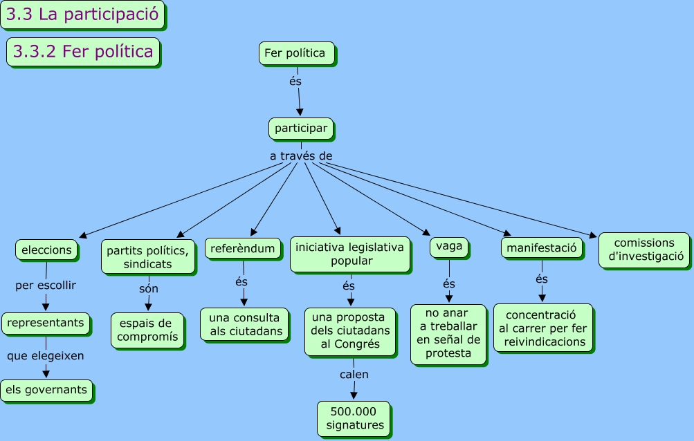 Aquest mapa conceptual conté informació relacionada amb: 3.3.2 Fer política, participar a través de manifestació, manifestació és concentració al carrer per fer reivindicacions, participar a través de eleccions, representants que elegeixen els governants, referèndum és una consulta als ciutadans, participar a través de vaga, partits polítics, sindicats són espais de compromís, Fer política és participar, vaga és no anar a treballar en señal de protesta, participar a través de comissions d'investigació, eleccions per escollir representants, participar a través de referèndum, iniciativa legislativa popular és una proposta dels ciutadans al Congrés, una proposta dels ciutadans al Congrés calen 500.000 signatures, participar a través de partits polítics, sindicats, participar a través de iniciativa legislativa popular