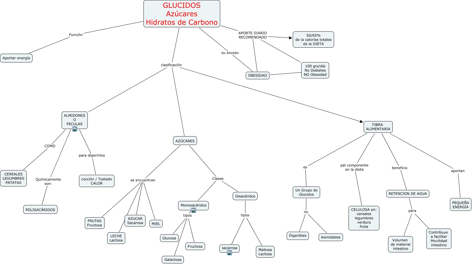 Este Cmap, tiene información relacionada con: GLUCIDOS, GLUCIDOS Azúcares Hidratos de Carbono Función Aportar energía, OBESIDAD APORTE DIARIO RECOMENDADO 100 grs/día No Diabetes NO Obesidad, AZÚCARES Clases Monosacáridos, Disacáridos tipos Maltosa Lactosa, Monosacáridos tipos Glucosa, AZÚCARES se encuentran MIEL, FIBRA ALIMENTARIA aportan PEQUEÑA ENERGÍA, AZÚCARES se encuentran LECHE Lactosa, Monosacáridos tipos Fructosa, FIBRA ALIMENTARIA pal componente en la dieta CELULOSA en: cereales legumbres verdura fruta, GLUCIDOS Azúcares Hidratos de Carbono clasificación AZÚCARES, FIBRA ALIMENTARIA beneficio RETENCION DE AGUA, GLUCIDOS Azúcares Hidratos de Carbono su exceso OBESIDAD, Un Grupo de Glucidos no Asimilables, GLUCIDOS Azúcares Hidratos de Carbono APORTE DIARIO RECOMENDADO 50/65% de la calorías totales de la DIETA, ALMIDONES O FECULAS para digeririlos cocción / Tostado CALOR, ALMIDONES O FECULAS Químicamente son: POLISACÁRIDOS, GLUCIDOS Azúcares Hidratos de Carbono clasificación FIBRA ALIMENTARIA, RETENCION DE AGUA para Volumen de material intestino, Un Grupo de Glucidos no Digeribles