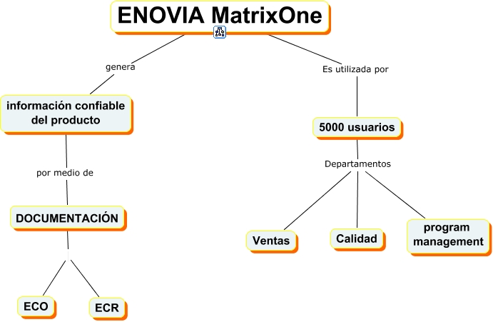 Este Cmap, tiene información relacionada con: F2, ENOVIA MatrixOne genera información confiable del producto, información confiable del producto por medio de DOCUMENTACIÓN, 5000 usuarios Departamentos program management, 5000 usuarios Departamentos Ventas, DOCUMENTACIÓN ECR, 5000 usuarios Departamentos Calidad, DOCUMENTACIÓN ECO, ENOVIA MatrixOne Es utilizada por 5000 usuarios
