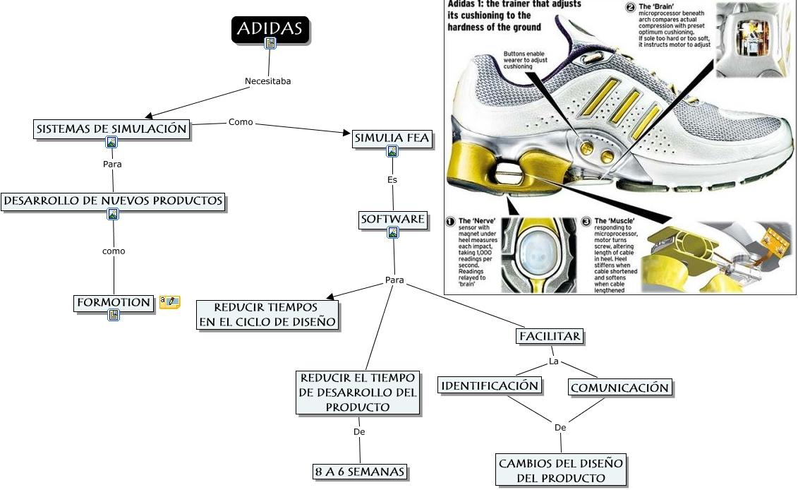 Este Cmap, tiene información relacionada con: ADIDAS 1, SISTEMAS DE SIMULACIÓN Como SIMULIA FEA, ADIDAS Necesitaba SISTEMAS DE SIMULACIÓN, SOFTWARE Para FACILITAR, REDUCIR EL TIEMPO DE DESARROLLO DEL PRODUCTO De 8 A 6 SEMANAS, SIMULIA FEA Es SOFTWARE, FACILITAR La COMUNICACIÓN, SISTEMAS DE SIMULACIÓN Para DESARROLLO DE NUEVOS PRODUCTOS, SOFTWARE Para REDUCIR EL TIEMPO DE DESARROLLO DEL PRODUCTO, DESARROLLO DE NUEVOS PRODUCTOS como FORMOTION, FACILITAR La IDENTIFICACIÓN, COMUNICACIÓN De CAMBIOS DEL DISEÑO DEL PRODUCTO, IDENTIFICACIÓN De CAMBIOS DEL DISEÑO DEL PRODUCTO, SOFTWARE Para REDUCIR TIEMPOS EN EL CICLO DE DISEÑO
