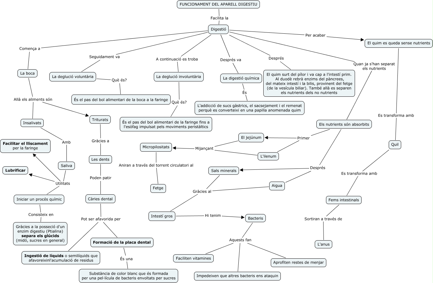 Este Cmap, tiene información relacionada con: nutrició 2, La boca Allà els aliments són Triturats, Saliva Utilitats Facilitar el lliscament per la faringe, Triturats Gràcies a Les dents, Saliva Utilitats Iniciar un procés químic, Digestió Després El quim surt del pílor i va cap a l'intestí prim. Al duodè rebrà enzims del pàncrees, del mateix intestí i la bilis, provinent del fetge (de la vesícula biliar). També allà es separen els nutrients dels no nutrients, Càries dental Pot ser afavorida per Formació de la placa dental, Sals minerals Gràcies al Intestí gros, Formació de la placa dental És una Substància de color blanc que és formada per una pel·lícula de bacteris envoltats per sucres, Les dents Poden patir Càries dental, Digestió Comença a La boca, Digestió Per acabar El quim es queda sense nutrients, Bacteris Aquests fan Faciliten vitamines, El quim es queda sense nutrients Es transforma amb Quil, Fems intestinals Sortiran a través de L'anus, Micropilositats Aniran a través del torrent circulatori al Fetge, FUNCIONAMENT DEL APARELL DIGESTIU Facilita la Digestió, La deglució voluntària Què és? És el pas del bol alimentari de la boca a la faringe, L'ilenum Mijançant Micropilositats, Càries dental Pot ser afavorida per Ingestió de líquids o semilíquids que afavoreixinl'acumulació de residus, Els nutrients són absorbits Primer El jejúnum