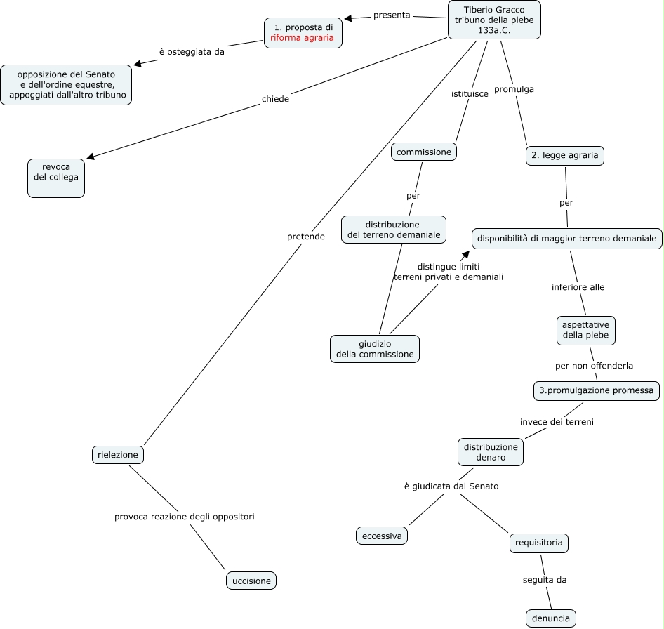 Questa Mappa Concettuale ha informazioni correlate a: riforma agraria, commissione per giudizio della commissione, Tiberio Gracco tribuno della plebe 133a.C. promulga 2. legge agraria, 3.promulgazione promessa invece dei terreni distribuzione denaro, Tiberio Gracco tribuno della plebe 133a.C. istituisce commissione, disponibilità di maggior terreno demaniale inferiore alle aspettative della plebe, distribuzione denaro è giudicata dal Senato eccessiva, rielezione provoca reazione degli oppositori uccisione, aspettative della plebe per non offenderla 3.promulgazione promessa, requisitoria seguita da denuncia, 1. proposta di riforma agraria è osteggiata da opposizione del Senato e dell'ordine equestre, appoggiati dall'altro tribuno