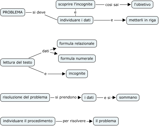 Questa Cmap, creata con IHMC CmapTools, contiene informazioni relative a: risolvere il problema, lettura del testo dati formula relazionale, i dati e si sommano, lettura del testo e incognite, lettura del testo dati formula numerale, individuare i dati e scoprire l'incognite, individuare i dati e metterli in riga, individuare il procedimento per risolvere il problema, risoluzione del problema si prendono i dati, scoprire l'incognite cosi sai l'obietivo, PROBLEMA si deve individuare i dati