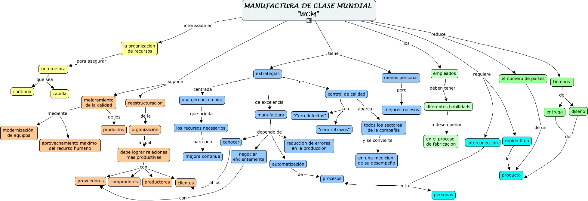 Este Cmap, tiene información relacionada con: MANUFACTURA DE CLASE MUNDIAL, la organizacion de recursos para asegurar una mejora, conocer al los clientes, control de calidad abarca todos los sectores de la compañia, una mejora que sea continua, una mejora que sea rapida, extrategias de excelencia manufactura, manufactura depende de conocer, MANUFACTURA DE CLASE MUNDIAL "WCM" tiene menos personal, MANUFACTURA DE CLASE MUNDIAL "WCM" requiere interconección, mejoramiento de la calidad mediente modernización de equipos, rapido flujo del producto, MANUFACTURA DE CLASE MUNDIAL "WCM" reduce el numero de partes, debe lograr relaciones mas productivas con clientes, negociar eficientemente con proveedores, control de calidad con "Cero defectos", interconección entre personas, manufactura depende de reduccion de errores en la producción, reestructuracion de la organización, los recursos necesarios para una mejora continua, extrategias centrada una gerencia mixta