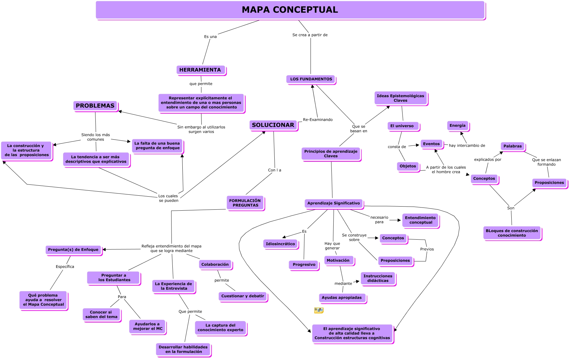 Este Cmap, tiene información relacionada con: Mapa Conceptual, Principios de aprendizaje Claves ???? Aprendizaje Significativo, Aprendizaje Significativo Es Progresivo, Ideas Epistemológicas Claves ???? El universo, Aprendizaje Significativo Hay que generar Motivación, SOLUCIONAR Con l a FORMULACIÓN PREGUNTAS, Aprendizaje Significativo necesario para Entendimiento conceptual, La Experiencia de la Entrevista Que permite La captura del conocimiento experto, PROBLEMAS Siendo los más comunes La construcción y la estructura de las proposiciones, Eventos hay intercambio de Energía, Objetos A partir de los cuales el hombre crea Eventos, La Experiencia de la Entrevista Que permite Desarrollar habilidades en la formulación, LOS FUNDAMENTOS Que se basan en Principios de aprendizaje Claves, La tendencia a ser más descriptivos que explicativos Los cuales se pueden La construcción y la estructura de las proposiciones, Representar explícitamente el entendimiento de una o mas personas sobre un campo del conocimiento Sin embargo al utilizarlos surgen varios PROBLEMAS, Conceptos explicados por Palabras, Aprendizaje Significativo Es Idiosincrático, Conceptos Son Proposiciones, MAPA CONCEPTUAL Se crea a partir de LOS FUNDAMENTOS, Preguntar a los Estudiantes Para Ayudarlos a mejorar el MC, El universo consta de Objetos