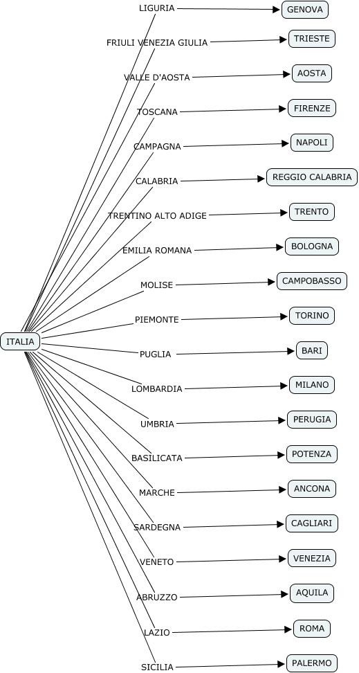 Questa Cmap, creata con IHMC CmapTools, contiene informazioni relative a: GEO, ITALIA CAMPAGNA NAPOLI, ITALIA SICILIA PALERMO, ITALIA PUGLIA BARI, ITALIA PIEMONTE TORINO, ITALIA ABRUZZO AQUILA, ITALIA LOMBARDIA MILANO, ITALIA VENETO VENEZIA, ITALIA BASILICATA POTENZA, ITALIA MOLISE CAMPOBASSO, ITALIA LAZIO ROMA, ITALIA CALABRIA REGGIO CALABRIA, ITALIA UMBRIA PERUGIA, ITALIA TOSCANA FIRENZE, ITALIA SARDEGNA CAGLIARI, ITALIA EMILIA ROMANA BOLOGNA, ITALIA VALLE D'AOSTA AOSTA, ITALIA FRIULI VENEZIA GIULIA TRIESTE, ITALIA TRENTINO ALTO ADIGE TRENTO, ITALIA LIGURIA GENOVA, ITALIA MARCHE ANCONA