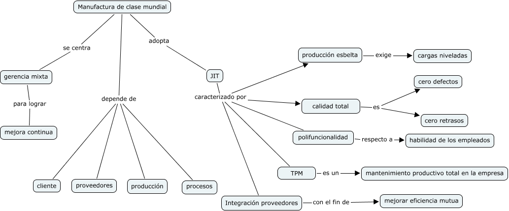 Este Cmap, tiene información relacionada con: Manufactura de clase mundial, polifuncionalidad respecto a habilidad de los empleados, JIT caracterizado por TPM, Manufactura de clase mundial depende de cliente, calidad total es cero retrasos, gerencia mixta para lograr mejora continua, Manufactura de clase mundial depende de procesos, calidad total es cero defectos, Manufactura de clase mundial depende de producción, JIT caracterizado por calidad total, JIT caracterizado por polifuncionalidad, Integración proveedores con el fin de mejorar eficiencia mutua, Manufactura de clase mundial adopta JIT, Manufactura de clase mundial depende de proveedores, TPM es un mantenimiento productivo total en la empresa, producción esbelta exige cargas niveladas, JIT caracterizado por producción esbelta, Manufactura de clase mundial se centra gerencia mixta, JIT caracterizado por Integración proveedores