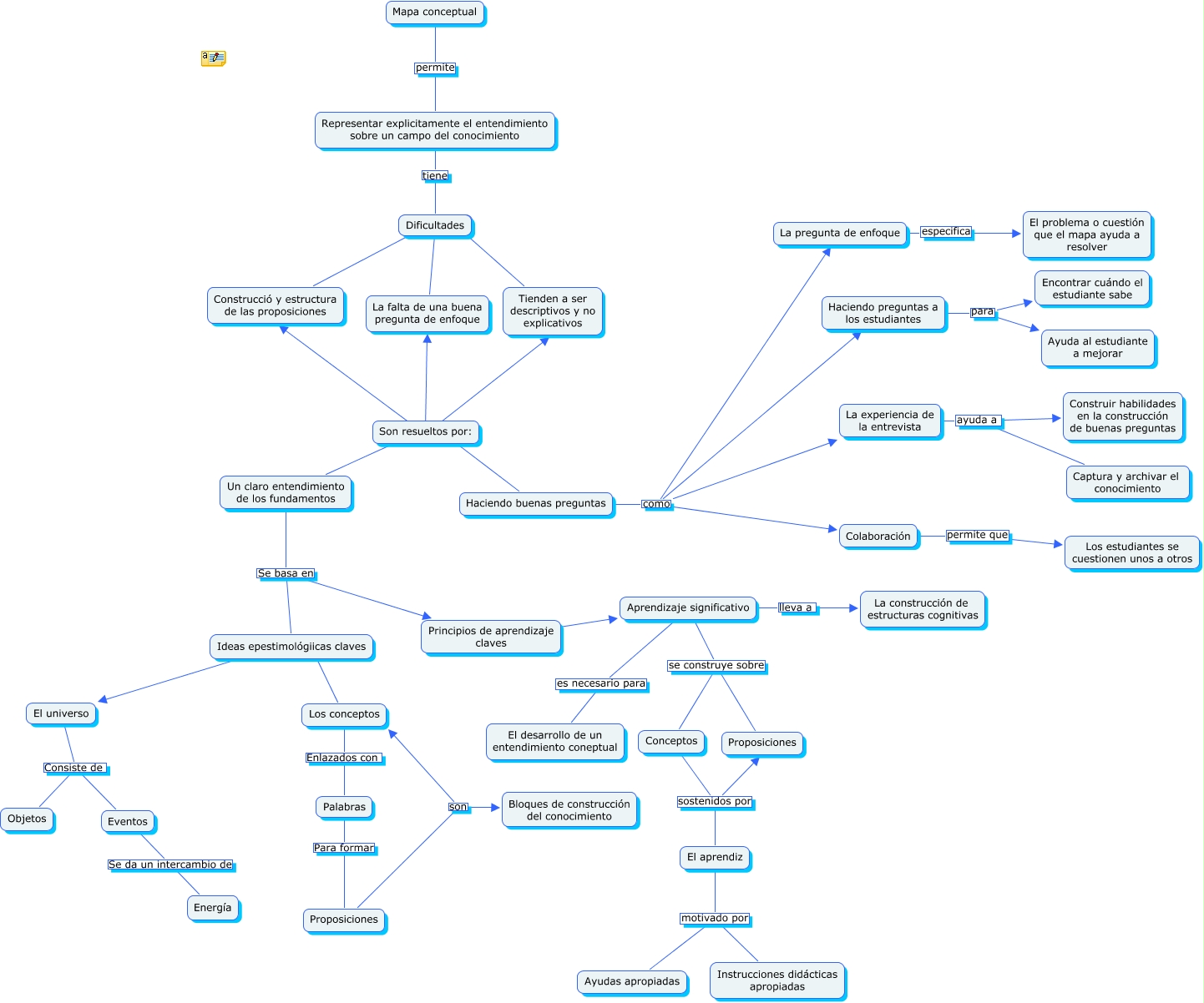 Este Cmap, tiene información relacionada con: Mapa conceptual, Eventos Se da un intercambio de Energía, Dificultades ???? La falta de una buena pregunta de enfoque, Son resueltos por: ???? Tienden a ser descriptivos y no explicativos, Ideas epestimológiicas claves ???? El universo, Haciendo buenas preguntas como La experiencia de la entrevista, Haciendo preguntas a los estudiantes para Ayuda al estudiante a mejorar, Mapa conceptual permite Representar explicitamente el entendimiento sobre un campo del conocimiento, Dificultades ???? Tienden a ser descriptivos y no explicativos, Aprendizaje significativo es necesario para El desarrollo de un entendimiento coneptual, Representar explicitamente el entendimiento sobre un campo del conocimiento tiene Dificultades, Son resueltos por: ???? La falta de una buena pregunta de enfoque, Colaboración permite que Los estudiantes se cuestionen unos a otros, La pregunta de enfoque especifica El problema o cuestión que el mapa ayuda a resolver, Palabras Para formar Proposiciones, Un claro entendimiento de los fundamentos Se basa en Principios de aprendizaje claves, Proposiciones son Los conceptos, Ideas epestimológiicas claves ???? Los conceptos, Proposiciones son Bloques de construcción del conocimiento, Haciendo buenas preguntas como Haciendo preguntas a los estudiantes, La experiencia de la entrevista ayuda a Captura y archivar el conocimiento