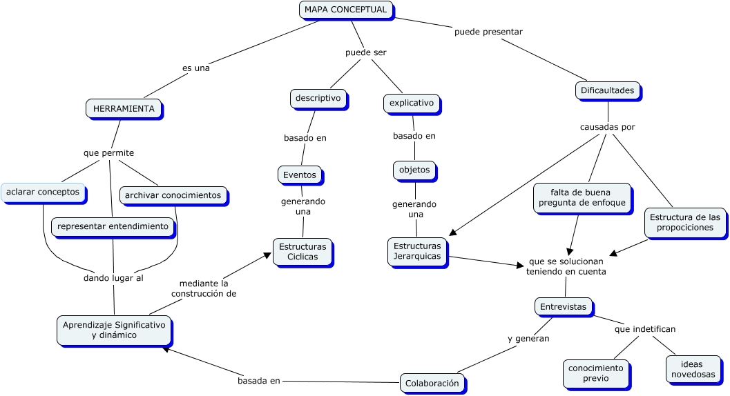 Este Cmap, tiene información relacionada con: Los Mapas Conceptuales, Entrevistas y generan Colaboración, HERRAMIENTA que permite aclarar conceptos, representar entendimiento dando lugar al Aprendizaje Significativo y dinámico, Estructuras Jerarquicas que se solucionan teniendo en cuenta Entrevistas, Eventos generando una Estructuras Ciclicas, Estructura de las propociciones que se solucionan teniendo en cuenta Entrevistas, Aprendizaje Significativo y dinámico mediante la construcción de Estructuras Ciclicas, HERRAMIENTA que permite representar entendimiento, MAPA CONCEPTUAL puede ser explicativo, MAPA CONCEPTUAL puede ser descriptivo, Dificaultades causadas por Estructura de las propociciones, Entrevistas que indetifican ideas novedosas, MAPA CONCEPTUAL puede presentar Dificaultades, Entrevistas que indetifican conocimiento previo, Dificaultades causadas por Estructuras Jerarquicas, descriptivo basado en Eventos, falta de buena pregunta de enfoque que se solucionan teniendo en cuenta Entrevistas, objetos generando una Estructuras Jerarquicas, Dificaultades causadas por falta de buena pregunta de enfoque, aclarar conceptos dando lugar al Aprendizaje Significativo y dinámico