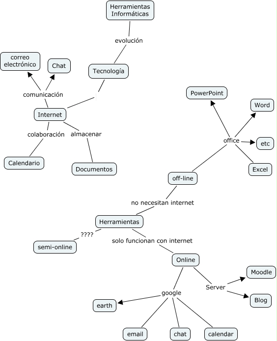 Este Cmap, tiene información relacionada con: Herramientas Virtuales, off-line office etc, Online google calendar, Tecnología Internet, Internet colaboración Calendario, Internet comunicación Chat, Online Server Moodle, off-line office Word, off-line no necesitan internet Herramientas, Online google chat, Internet almacenar Documentos, Online google email, off-line office Excel, Online Server Blog, Internet comunicación correo electrónico, Online google earth, off-line office PowerPoint, Herramientas ???? semi-online, Herramientas Informáticas evolución Tecnología, Herramientas solo funcionan con internet Online