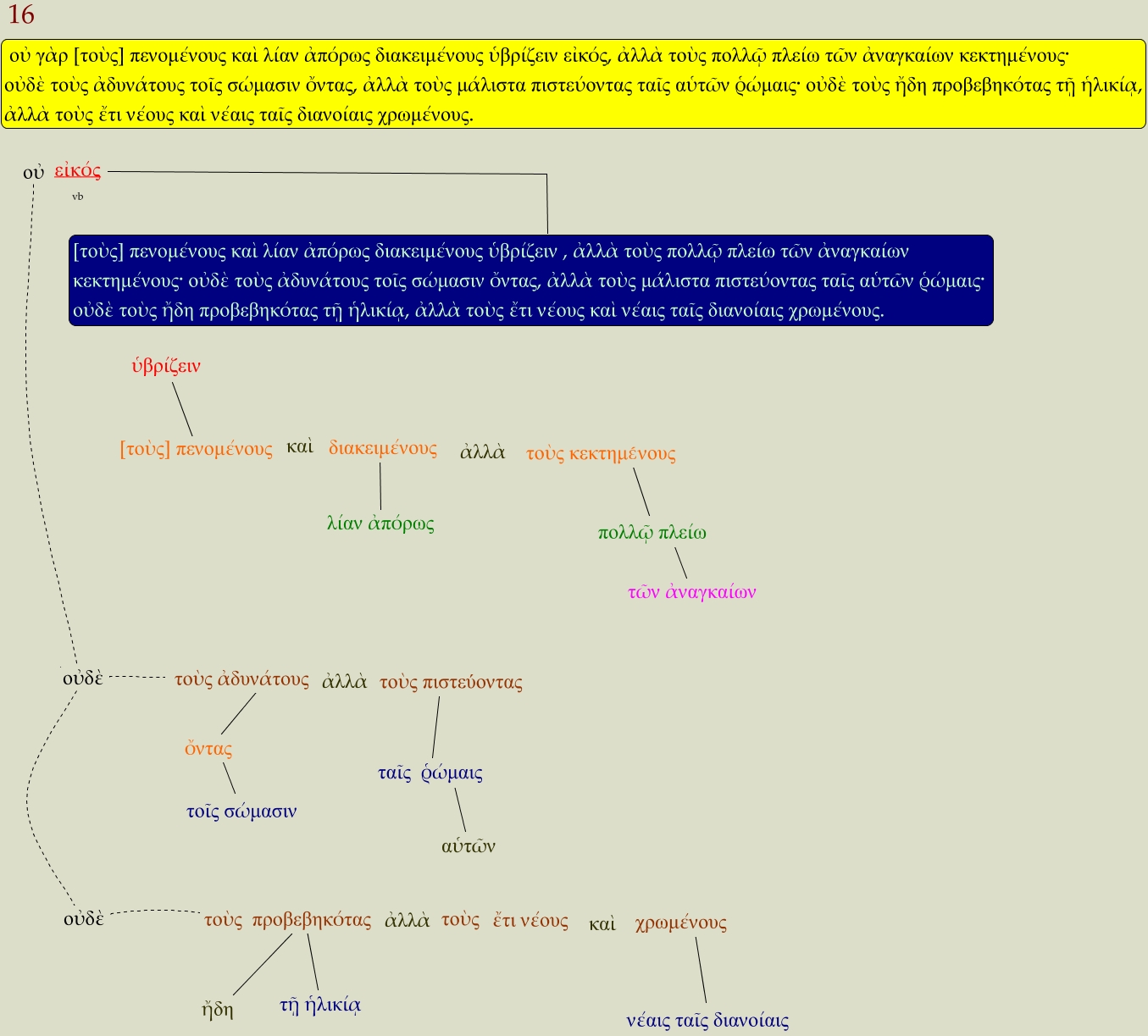 Este Cmap, tiene información relacionada con: frag.16, εἰκός ???? [τοὺς] πενομένους καὶ λίαν ἀπόρως διακειμένους ὑβρίζειν , ἀλλὰ τοὺς πολλῷ πλείω τῶν ἀναγκαίων κεκτημένους· οὐδὲ τοὺς ἀδυνάτους τοῖς σώμασιν ὄντας, ἀλλὰ τοὺς μάλιστα πιστεύοντας ταῖς αὑτῶν ῥώμαις· οὐδὲ τοὺς ἤδη προβεβηκότας τῇ ἡλικίᾳ, ἀλλὰ τοὺς ἔτι νέους καὶ νέαις ταῖς διανοίαις χρωμένους., οὐδὲ ???? οὐδὲ, ταῖς ῥώμαις ???? τοὺς πιστεύοντας, τῇ ἡλικίᾳ ???? τοὺς προβεβηκότας, ἤδη ???? τοὺς προβεβηκότας, οὐ ???? οὐδὲ, νέαις ταῖς διανοίαις ???? χρωμένους, τῶν ἀναγκαίων ???? πολλῷ πλείω, τοῖς σώμασιν ???? ὄντας, λίαν ἀπόρως ???? διακειμένους, οὐδὲ ???? τοὺς ἀδυνάτους, αὑτῶν ???? ταῖς ῥώμαις, πολλῷ πλείω ???? τοὺς κεκτημένους, ὑβρίζειν ???? [τοὺς] πενομένους, οὐδὲ ???? τοὺς προβεβηκότας, ὄντας ???? τοὺς ἀδυνάτους