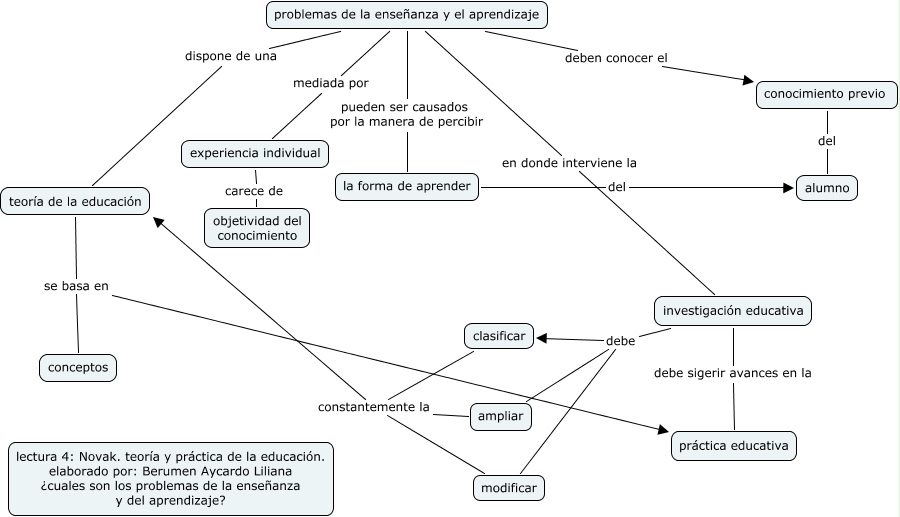 Este Cmap, tiene información relacionada con: lectura 4 corregida, la forma de aprender del alumno, clasificar constantemente la teoría de la educación, experiencia individual carece de objetividad del conocimiento, problemas de la enseñanza y el aprendizaje deben conocer el conocimiento previo, conocimiento previo del alumno, problemas de la enseñanza y el aprendizaje en donde interviene la investigación educativa, modificar constantemente la teoría de la educación, problemas de la enseñanza y el aprendizaje mediada por experiencia individual, investigación educativa debe sigerir avances en la práctica educativa, investigación educativa debe modificar, teoría de la educación se basa en práctica educativa, investigación educativa debe ampliar, problemas de la enseñanza y el aprendizaje pueden ser causados por la manera de percibir la forma de aprender, teoría de la educación se basa en conceptos, problemas de la enseñanza y el aprendizaje dispone de una teoría de la educación, ampliar constantemente la teoría de la educación, investigación educativa debe clasificar