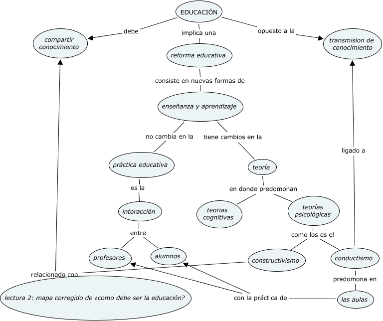 Este Cmap, tiene información relacionada con: lect. 2 corregido, conductismo ligado a transmision de conocimiento, práctica educativa es la interacción, interacción entre profesores, reforma educativa consiste en nuevas formas de enseñanza y aprendizaje, EDUCACIÓN debe compartir conocimiento, teorías psicológicas como los es el constructivismo, las aulas con la práctica de alumnos, constructivismo relacionado con compartir conocimiento, EDUCACIÓN implica una reforma educativa, teoría en donde predomonan teorias cognitivas, enseñanza y aprendizaje tiene cambios en la teoría, interacción entre alumnos, enseñanza y aprendizaje no cambia en la práctica educativa, EDUCACIÓN opuesto a la transmision de conocimiento, teorías psicológicas como los es el conductismo, conductismo predomona en las aulas, teoría en donde predomonan teorías psicológicas, las aulas con la práctica de profesores