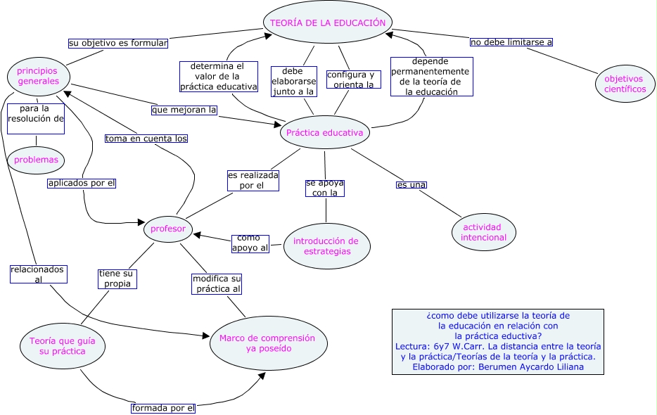 Este Cmap, tiene información relacionada con: lectura 6 y 7, TEORÍA DE LA EDUCACIÓN no debe limitarse a objetivos científicos, principios generales que mejoran la Práctica educativa, principios generales para la resolución de problemas, Práctica educativa se apoya con la introducción de estrategias, introducción de estrategias como apoyo al profesor, TEORÍA DE LA EDUCACIÓN configura y orienta la Práctica educativa, Teoría que guía su práctica formada por el Marco de comprensión ya poseído, principios generales aplicados por el profesor, profesor toma en cuenta los principios generales, Práctica educativa es una actividad intencional, TEORÍA DE LA EDUCACIÓN debe elaborarse junto a la Práctica educativa, Práctica educativa es realizada por el profesor, TEORÍA DE LA EDUCACIÓN su objetivo es formular principios generales, profesor tiene su propia Teoría que guía su práctica, profesor modifica su práctica al Marco de comprensión ya poseído, principios generales relacionados al Marco de comprensión ya poseído, Práctica educativa depende permanentemente de la teoría de la educación TEORÍA DE LA EDUCACIÓN, Práctica educativa determina el valor de la práctica educativa TEORÍA DE LA EDUCACIÓN