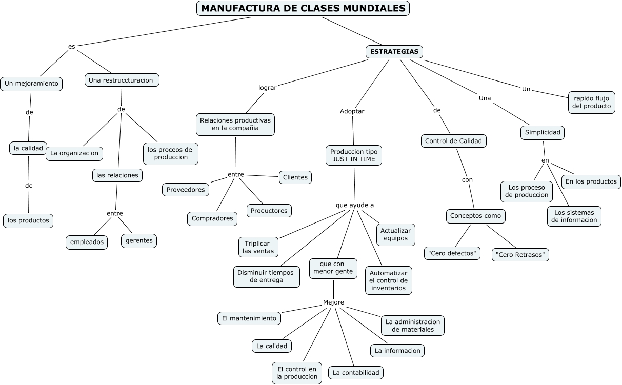 Este Cmap, tiene información relacionada con: Manufactura de Clases Mundiales, Relaciones productivas en la compañia entre Proveedores, las relaciones entre gerentes, MANUFACTURA DE CLASES MUNDIALES ???? ESTRATEGIAS, Produccion tipo JUST IN TIME que ayude a Automatizar el control de inventarios, ESTRATEGIAS lograr Relaciones productivas en la compañia, Una restruccturacion de las relaciones, Produccion tipo JUST IN TIME que ayude a Disminuir tiempos de entrega, que con menor gente Mejore El control en la produccion, Conceptos como ???? "Cero Retrasos", que con menor gente Mejore La administracion de materiales, Produccion tipo JUST IN TIME que ayude a Actualizar equipos, que con menor gente Mejore La informacion, MANUFACTURA DE CLASES MUNDIALES es Una restruccturacion, la calidad de los productos, ESTRATEGIAS de Control de Calidad, Relaciones productivas en la compañia entre Compradores, Una restruccturacion de los proceos de produccion, Simplicidad en Los sistemas de informacion, MANUFACTURA DE CLASES MUNDIALES es Un mejoramiento, Un mejoramiento de la calidad
