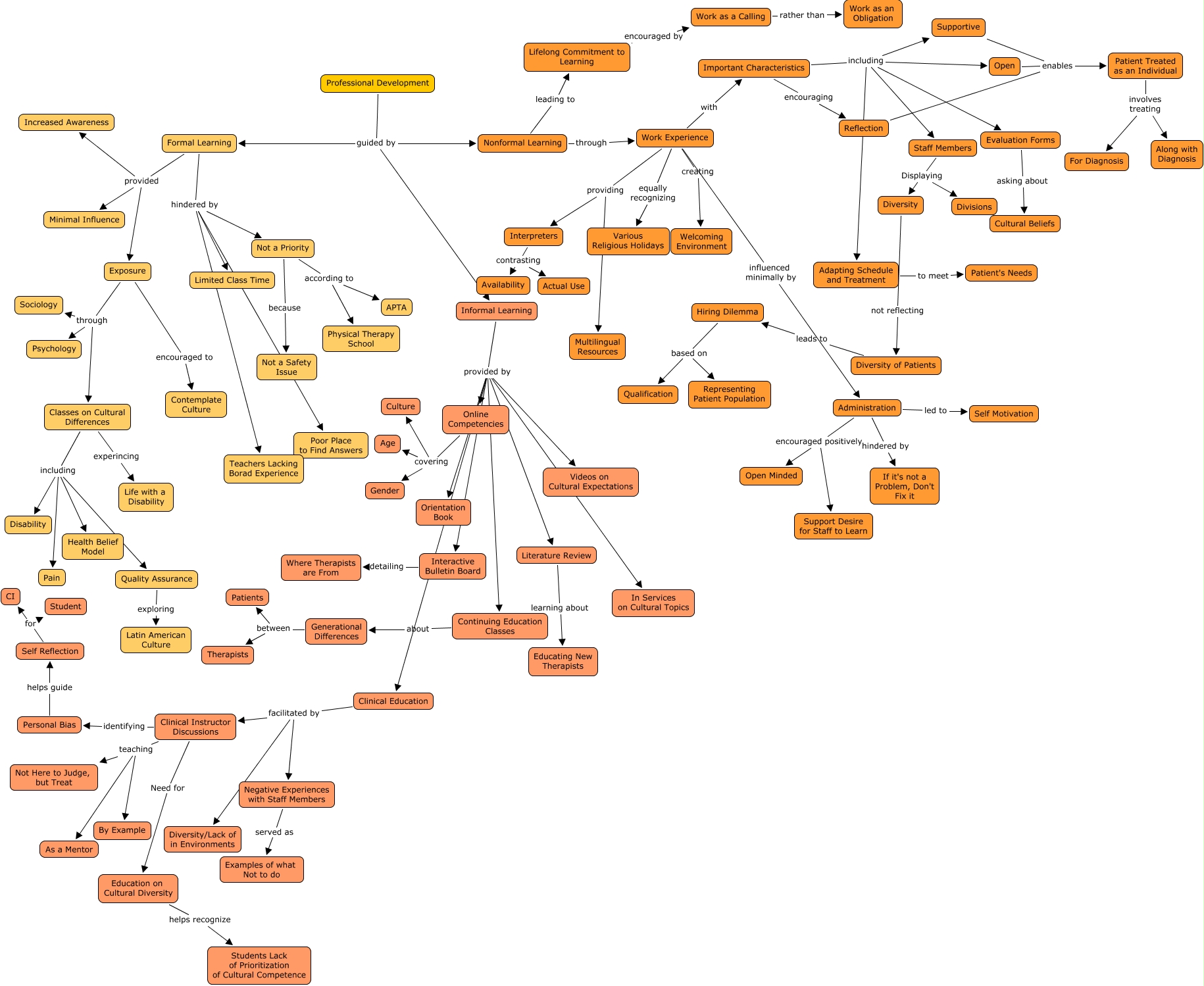 This Concept Map, created with IHMC CmapTools, has information related to: Professional Development, Quality Assurance exploring Latin American Culture, Open enables Patient Treated as an Individual, Patient Treated as an Individual involves treating Along with Diagnosis, Nonformal Learning leading to Lifelong Commitment to Learning, Adapting Schedule and Treatment to meet Patient's Needs, Hiring Dilemma based on Qualification, Clinical Instructor Discussions identifying Personal Bias, Supportive enables Patient Treated as an Individual, Interpreters contrasting Availability, Work Experience providing Interpreters, Administration encouraged positively Support Desire for Staff to Learn, Informal Learning provided by Continuing Education Classes, Nonformal Learning through Work Experience, Clinical Instructor Discussions teaching As a Mentor, Important Characteristics including Adapting Schedule and Treatment, Interactive Bulletin Board detailing Where Therapists are From, Classes on Cultural Differences including Health Belief Model, Clinical Education facilitated by Clinical Instructor Discussions, Important Characteristics including Evaluation Forms, Work as a Calling rather than Work as an Obligation