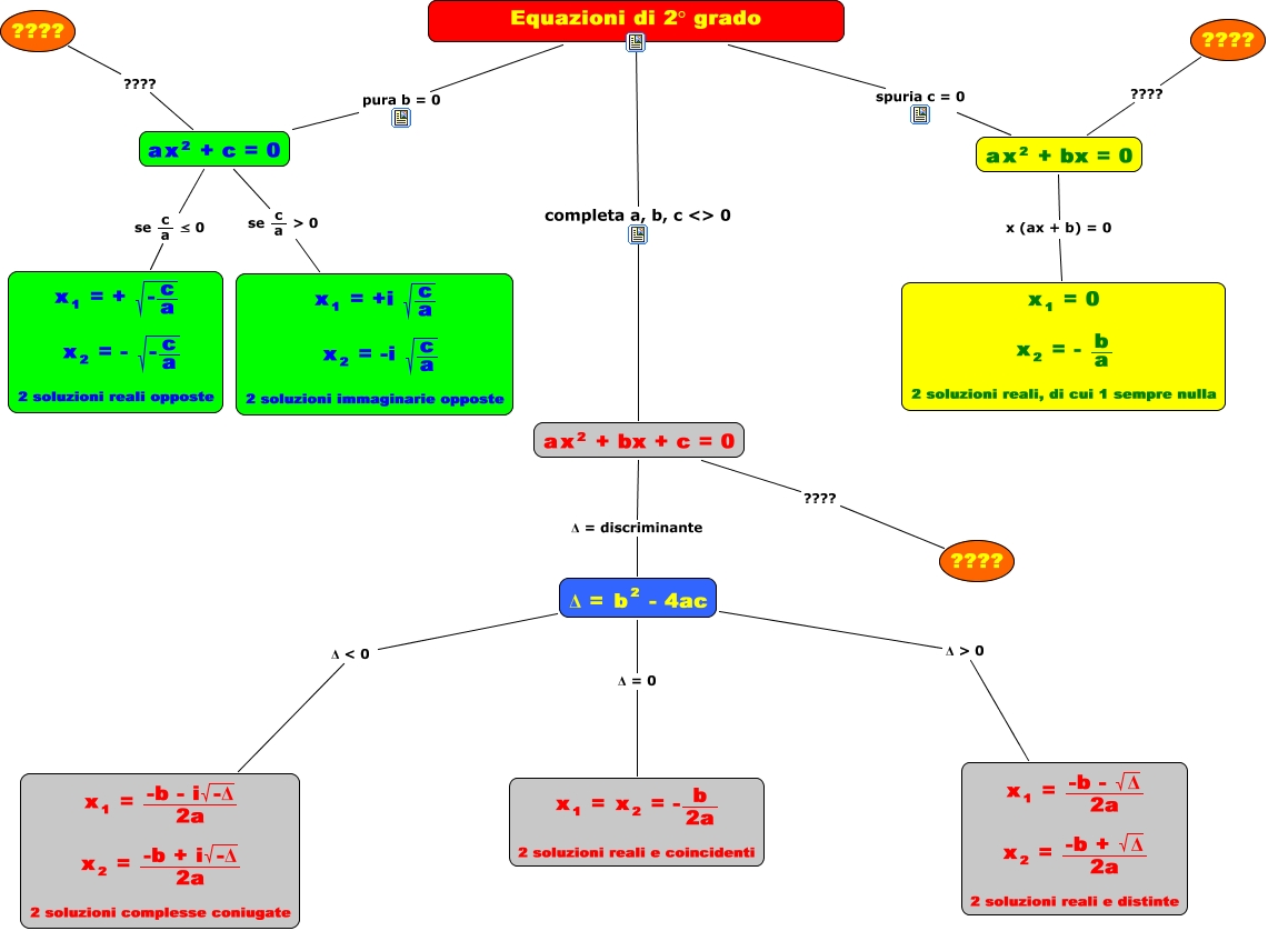 Questa Cmap, creata con IHMC CmapTools, contiene informazioni relative a: equazioni, <math xmlns="http://www.w3.org/1998/Math/MathML"> <mrow> <mtext> a </mtext> <mmultiscripts> <mtext> x </mtext> <none/> <mtext> 2 </mtext> </mmultiscripts> <mtext> + c = 0 </mtext> </mrow> </math> <math xmlns="http://www.w3.org/1998/Math/MathML"> <mrow> <mtext> se </mtext> <mfrac> <mtext> c </mtext> <mtext> a </mtext> </mfrac> <mtext> > 0 </mtext> </mrow> </math> <math xmlns="http://www.w3.org/1998/Math/MathML"> <mtable> <mtr> <mtd> <mrow> <mmultiscripts> <mtext> x </mtext> <mtext> 1 </mtext> <none/> </mmultiscripts> <mtext> = +i </mtext> <msqrt> <mrow> <mfrac> <mtext> c </mtext> <mtext> a </mtext> </mfrac> </mrow> </msqrt> </mrow> </mtd> </mtr> <mtr> <mtd> <mrow> <mtext> </mtext> <mmultiscripts> <mtext> x </mtext> <mtext> 2 </mtext> <none/> </mmultiscripts> <mtext> = -i </mtext> <msqrt> <mrow> <mfrac> <mtext> c </mtext> <mtext> a </mtext> </mfrac> </mrow> </msqrt> </mrow> </mtd> </mtr> <mtr> <mtd> <mtext> 2 soluzioni immaginarie opposte </mtext> </mtd> </mtr> </mtable> </math>, <math xmlns="http://www.w3.org/1998/Math/MathML"> <mrow> <mtext> Δ = </mtext> <mmultiscripts> <mtext> b </mtext> <none/> <mtext> 2 </mtext> </mmultiscripts> <mtext> - 4ac </mtext> </mrow> </math> Δ < 0 <math xmlns="http://www.w3.org/1998/Math/MathML"> <mrow> <mtable> <mtr> <mtd> <mmultiscripts> <mtext> x </mtext> <mtext> 1 </mtext> <none/> </mmultiscripts> <mtext> = </mtext> <mfrac> <mrow> <mtext> -b - i </mtext> <msqrt> <mtext> -Δ </mtext> </msqrt> </mrow> <mtext> 2a </mtext> </mfrac> </mtd> </mtr> <mtr> <mtd> <mmultiscripts> <mtext> x </mtext> <mtext> 2 </mtext> <none/> </mmultiscripts> <mtext> = </mtext> <mfrac> <mrow> <mtext> -b + i </mtext> <msqrt> <mtext> -Δ </mtext> </msqrt> </mrow> <mtext> 2a </mtext> </mfrac> </mtd> </mtr> <mtr> <mtd> <mtext> 2 soluzioni complesse coniugate </mtext> </mtd> </mtr> </mtable> </mrow> </math>, <math xmlns="http://www.w3.org/1998/Math/MathML"> <mrow> <mtext> a </mtext> <mmultiscripts> <mtext> x </mtext> <none/> <mtext> 2 </mtext> </mmultiscripts> <mtext> + bx + c = 0 </mtext> </mrow> </math> ???? ????, Equazioni di 2° grado completa a, b, c <> 0 <math xmlns="http://www.w3.org/1998/Math/MathML"> <mrow> <mtext> a </mtext> <mmultiscripts> <mtext> x </mtext> <none/> <mtext> 2 </mtext> </mmultiscripts> <mtext> + bx + c = 0 </mtext> </mrow> </math>, <math xmlns="http://www.w3.org/1998/Math/MathML"> <mrow> <mtext> a </mtext> <mmultiscripts> <mtext> x </mtext> <none/> <mtext> 2 </mtext> </mmultiscripts> <mtext> + bx = 0 </mtext> </mrow> </math> x (ax + b) = 0 <math xmlns="http://www.w3.org/1998/Math/MathML"> <mtable> <mtr> <mtd> <mmultiscripts> <mtext> x </mtext> <mtext> 1 </mtext> <none/> </mmultiscripts> <mtext> = 0 </mtext> </mtd> </mtr> <mtr> <mtd> <mmultiscripts> <mtext> x </mtext> <mtext> 2 </mtext> <none/> </mmultiscripts> <mtext> = - </mtext> <mfrac> <mtext> b </mtext> <mtext> a </mtext> </mfrac> </mtd> </mtr> <mtr> <mtd> <mtext> 2 soluzioni reali, di cui 1 sempre nulla </mtext> </mtd> </mtr> </mtable> </math>, Equazioni di 2° grado pura b = 0 <math xmlns="http://www.w3.org/1998/Math/MathML"> <mrow> <mtext> a </mtext> <mmultiscripts> <mtext> x </mtext> <none/> <mtext> 2 </mtext> </mmultiscripts> <mtext> + c = 0 </mtext> </mrow> </math>, <math xmlns="http://www.w3.org/1998/Math/MathML"> <mrow> <mtext> a </mtext> <mmultiscripts> <mtext> x </mtext> <none/> <mtext> 2 </mtext> </mmultiscripts> <mtext> + bx = 0 </mtext> </mrow> </math> ???? ????, Equazioni di 2° grado spuria c = 0 <math xmlns="http://www.w3.org/1998/Math/MathML"> <mrow> <mtext> a </mtext> <mmultiscripts> <mtext> x </mtext> <none/> <mtext> 2 </mtext> </mmultiscripts> <mtext> + bx = 0 </mtext> </mrow> </math>, <math xmlns="http://www.w3.org/1998/Math/MathML"> <mrow> <mtext> a </mtext> <mmultiscripts> <mtext> x </mtext> <none/> <mtext> 2 </mtext> </mmultiscripts> <mtext> + bx + c = 0 </mtext> </mrow> </math> Δ = discriminante <math xmlns="http://www.w3.org/1998/Math/MathML"> <mrow> <mtext> Δ = </mtext> <mmultiscripts> <mtext> b </mtext> <none/> <mtext> 2 </mtext> </mmultiscripts> <mtext> - 4ac </mtext> </mrow> </math>, <math xmlns="http://www.w3.org/1998/Math/MathML"> <mrow> <mtext> a </mtext> <mmultiscripts> <mtext> x </mtext> <none/> <mtext> 2 </mtext> </mmultiscripts> <mtext> + c = 0 </mtext> </mrow> </math> <math xmlns="http://www.w3.org/1998/Math/MathML"> <mrow> <mtext> se </mtext> <mfrac> <mtext> c </mtext> <mtext> a </mtext> </mfrac> <mtext> ≤ 0 </mtext> </mrow> </math> <math xmlns="http://www.w3.org/1998/Math/MathML"> <mtable> <mtr> <mtd> <mrow> <mmultiscripts> <mtext> x </mtext> <mtext> 1 </mtext> <none/> </mmultiscripts> <mtext> = + </mtext> <msqrt> <mrow> <mtext> - </mtext> <mfrac> <mtext> c </mtext> <mtext> a </mtext> </mfrac> </mrow> </msqrt> </mrow> </mtd> </mtr> <mtr> <mtd> <mrow> <mtext> </mtext> <mmultiscripts> <mtext> x </mtext> <mtext> 2 </mtext> <none/> </mmultiscripts> <mtext> = - </mtext> <msqrt> <mrow> <mtext> - </mtext> <mfrac> <mtext> c </mtext> <mtext> a </mtext> </mfrac> </mrow> </msqrt> </mrow> </mtd> </mtr> <mtr> <mtd> <mtext> 2 soluzioni reali opposte </mtext> </mtd> </mtr> </mtable> </math>, <math xmlns="http://www.w3.org/1998/Math/MathML"> <mrow> <mtext> a </mtext> <mmultiscripts> <mtext> x </mtext> <none/> <mtext> 2 </mtext> </mmultiscripts> <mtext> + c = 0 </mtext> </mrow> </math> ???? ????, <math xmlns="http://www.w3.org/1998/Math/MathML"> <mrow> <mtext> Δ = </mtext> <mmultiscripts> <mtext> b </mtext> <none/> <mtext> 2 </mtext> </mmultiscripts> <mtext> - 4ac </mtext> </mrow> </math> Δ > 0 <math xmlns="http://www.w3.org/1998/Math/MathML"> <mrow> <mtable> <mtr> <mtd> <mmultiscripts> <mtext> x </mtext> <mtext> 1 </mtext> <none/> </mmultiscripts> <mtext> = </mtext> <mfrac> <mrow> <mtext> -b - </mtext> <msqrt> <mtext> Δ </mtext> </msqrt> </mrow> <mtext> 2a </mtext> </mfrac> </mtd> </mtr> <mtr> <mtd> <mmultiscripts> <mtext> x </mtext> <mtext> 2 </mtext> <none/> </mmultiscripts> <mtext> = </mte