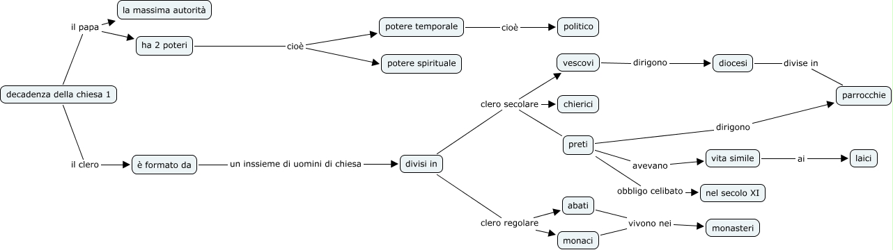 Questa Cmap, creata con IHMC CmapTools, contiene informazioni relative a: decadenza 1, ha 2 poteri cioè potere spirituale, divisi in clero secolare chierici, decadenza della chiesa 1 il papa la massima autorità, preti dirigono parrocchie, ha 2 poteri cioè potere temporale, decadenza della chiesa 1 il clero è formato da, abati vivono nei monasteri, preti obbligo celibato nel secolo XI, diocesi divise in parrocchie, divisi in clero regolare abati, divisi in clero secolare preti, vita simile ai laici, divisi in clero secolare vescovi, vescovi dirigono diocesi, preti avevano vita simile, è formato da un inssieme di uomini di chiesa divisi in, potere temporale cioè politico, monaci vivono nei monasteri, decadenza della chiesa 1 il papa ha 2 poteri, divisi in clero regolare monaci