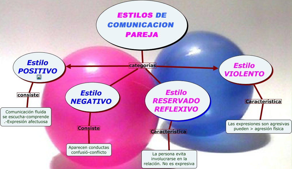 Este Cmap, tiene información relacionada con: Estilos de comunicación Pareja, ESTILOS DE COMUNICACION PAREJA categorías Estilo RESERVADO REFLEXIVO, Estilo NEGATIVO Consiste Aparecen conductas confusió-conflicto, ESTILOS DE COMUNICACION PAREJA categorías Estilo NEGATIVO, Estilo VIOLENTO Característica Las expresiones son agresivas pueden > agresión física, ESTILOS DE COMUNICACION PAREJA categorías Estilo VIOLENTO, ESTILOS DE COMUNICACION PAREJA categorías Estilo POSITIVO, Estilo POSITIVO consiste Comunicación fluida se escucha-comprende .-Expresión afectuosa, Estilo RESERVADO REFLEXIVO Característica La persona evita involucrarse en la relación. No es expresiva