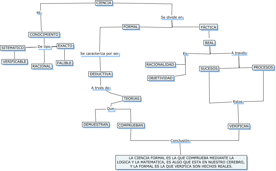 Este Cmap, tiene información relacionada con: CIENCIA, CIENCIA Se divide en FÁCTICA, CONOCIMIENTO De tipo FALIBLE, DEDUCTIVA A trvés de TEORIAS, FORMAL Se caracteriza por ser DEDUCTIVA, CONOCIMIENTO De tipo RACIONAL, TEORIAS Que COMPRUEBAN, SUCESOS Estos VERIFICAN, VERIFICAN Conclusión LA CIENCIA FORMAL ES LA QUE COMPRUEBA MEDIANTE LA LOGICA Y LA MATEMATICA, ES ALGO QUE ESTA EN NUESTRO CEREBRO, Y LA FORMAL ES LA QUE VERIFICA SON HECHOS REALES., CONOCIMIENTO De tipo VERIFICABLE, REAL A través SUCESOS, CIENCIA Se divide en FORMAL, FÁCTICA REAL, CONOCIMIENTO De tipo EXACTO, COMPRUEBAN Conclusión LA CIENCIA FORMAL ES LA QUE COMPRUEBA MEDIANTE LA LOGICA Y LA MATEMATICA, ES ALGO QUE ESTA EN NUESTRO CEREBRO, Y LA FORMAL ES LA QUE VERIFICA SON HECHOS REALES., TEORIAS Que DEMUESTRAN, REAL A través PROCESOS, REAL Es RACIONALIDAD, PROCESOS Estos VERIFICAN, REAL Es OBJETIVIDAD, CIENCIA es CONOCIMIENTO