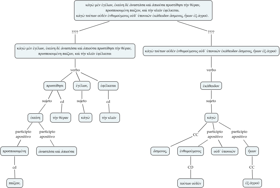 Este Cmap, tiene información relacionada con: Lisias I, 13_080006012009, κἀγὼ μὲν ἐγέλων, ἐκείνη δὲ ἀναστᾶσα καὶ ἀπιοῦσα προστίθησι τὴν θύραν, προσποιουμένη παίζειν, καὶ τὴν κλεῖν ἐφέλκεται. κἀγὼ τούτων οὐδὲν ἐνθυμούμενος οὐδ᾿ ὑπονοῶν ἐκάθευδον ἄσμενος, ἥκων ἐξ ἀγροῦ. ???? κἀγὼ μὲν ἐγέλων, ἐκείνη δὲ ἀναστᾶσα καὶ ἀπιοῦσα προστίθησι τὴν θύραν, προσποιουμένη παίζειν, καὶ τὴν κλεῖν ἐφέλκεται, κἀγὼ CC ἄσμενος,, ἐγέλων, sujeto κἀγὼ, ἐκείνη participio apositivo προσποιουμένη, ἥκων CC ἐξ ἀγροῦ, κἀγὼ μὲν ἐγέλων, ἐκείνη δὲ ἀναστᾶσα καὶ ἀπιοῦσα προστίθησι τὴν θύραν, προσποιουμένη παίζειν, καὶ τὴν κλεῖν ἐφέλκεται verbo ἐγέλων,, ἐνθυμούμενος CD τούτων οὐδὲν, ἐφέλκεται cd τὴν κλεῖν, κἀγὼ μὲν ἐγέλων, ἐκείνη δὲ ἀναστᾶσα καὶ ἀπιοῦσα προστίθησι τὴν θύραν, προσποιουμένη παίζειν, καὶ τὴν κλεῖν ἐφέλκεται verbo ἐφέλκεται, προσποιουμένη cd παίζειν,, κἀγὼ τούτων οὐδὲν ἐνθυμούμενος οὐδ᾿ ὑπονοῶν ἐκάθευδον ἄσμενος, ἥκων ἐξ ἀγροῦ verbo ἐκάθευδον, κἀγὼ participio apositivo ἥκων, κἀγὼ participio apositivo οὐδ᾿ ὑπονοῶν, κἀγὼ μὲν ἐγέλων, ἐκείνη δὲ ἀναστᾶσα καὶ ἀπιοῦσα προστίθησι τὴν θύραν, προσποιουμένη παίζειν, καὶ τὴν κλεῖν ἐφέλκεται. κἀγὼ τούτων οὐδὲν ἐνθυμούμενος οὐδ᾿ ὑπονοῶν ἐκάθευδον ἄσμενος, ἥκων ἐξ ἀγροῦ. ???? κἀγὼ τούτων οὐδὲν ἐνθυμούμενος οὐδ᾿ ὑπονοῶν ἐκάθευδον ἄσμενος, ἥκων ἐξ ἀγροῦ, κἀγὼ μὲν ἐγέλων, ἐκείνη δὲ ἀναστᾶσα καὶ ἀπιοῦσα προστίθησι τὴν θύραν, προσποιουμένη παίζειν, καὶ τὴν κλεῖν ἐφέλκεται verbo προστίθησι, ἐκάθευδον sujeto κἀγὼ, κἀγὼ participio apositivo ἐνθυμούμενος, προστίθησι sujeto ἐκείνη, προστίθησι cd τὴν θύραν, ἐκείνη participio apositivo ἀναστᾶσα καὶ ἀπιοῦσα