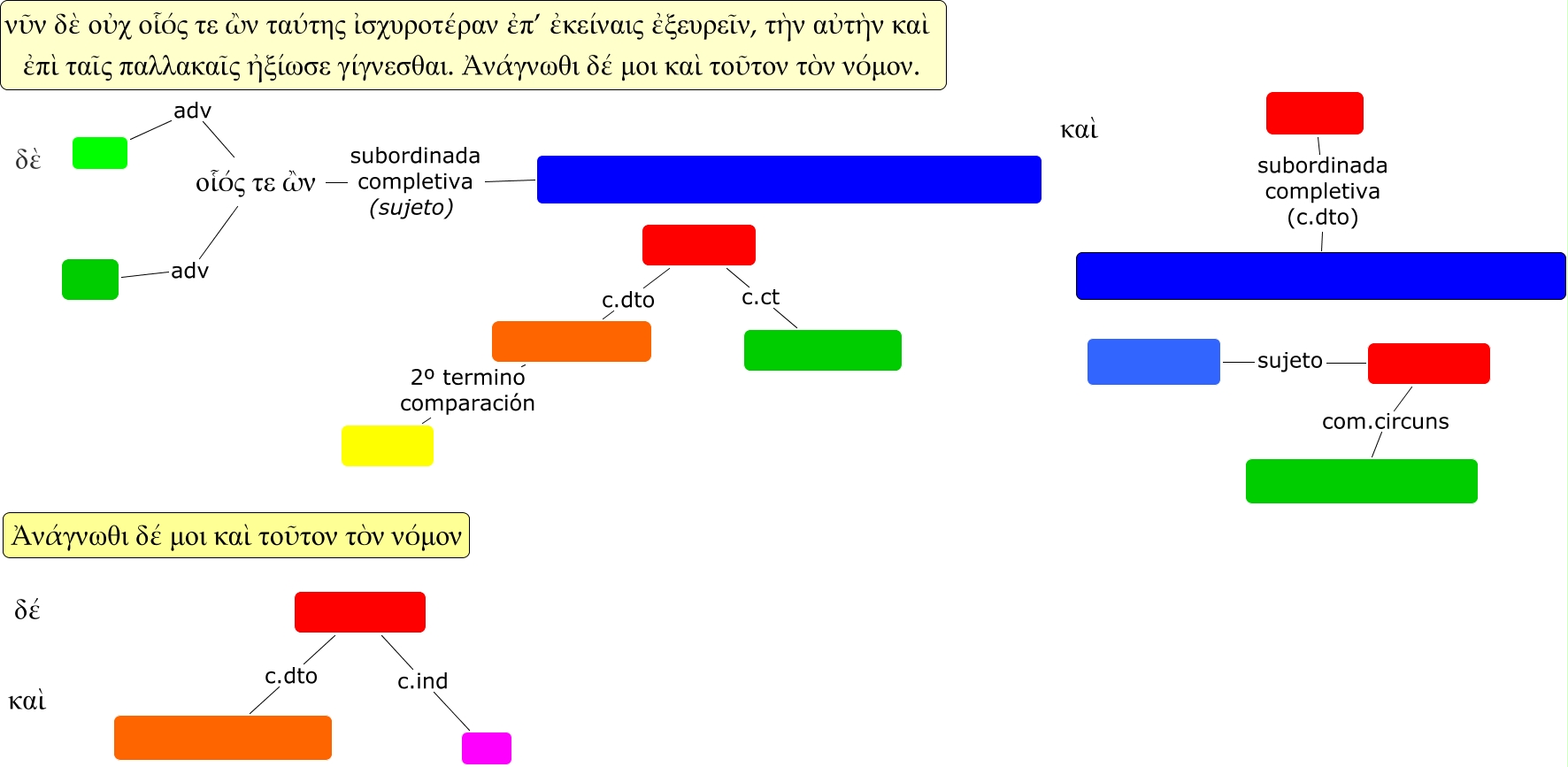 Este Cmap, tiene información relacionada con: 31 15 01 2bis, ἰσχυροτέραν 2º termino comparación ταύτης, οἷός τε ὢν subordinada completiva (sujeto) ταύτης ἰσχυροτέραν ἐπ’ ἐκείναις ἐξευρεῖν, Ἀνάγνωθι c.dto τοῦτον τὸν νόμον, νῦν adv οἷός τε ὢν, ἐξευρεῖν c.dto ἰσχυροτέραν, Ἀνάγνωθι c.ind μοι, γίγνεσθαι com.circuns ἐπὶ ταῖς παλλακαῖς, ἐξευρεῖν c.ct ἐπ’ ἐκείναις, τὴν αὐτὴν sujeto γίγνεσθαι, ἠξίωσε subordinada completiva (c.dto) τὴν αὐτὴν ἐπὶ ταῖς παλλακαῖς γίγνεσθαι, οὐχ adv οἷός τε ὢν