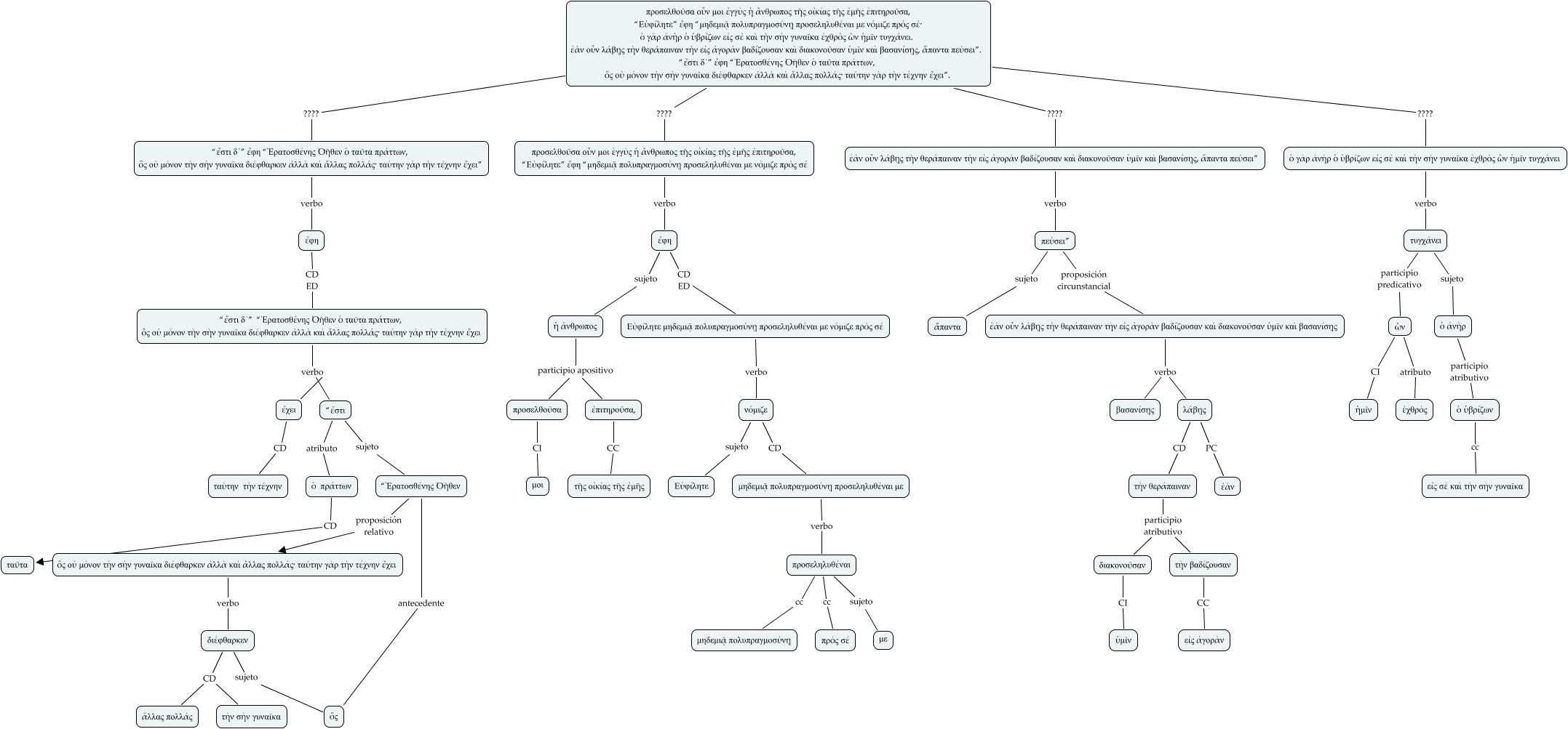 Este Cmap, tiene información relacionada con: Lisias I, 16_070008012009, τὴν βαδίζουσαν CC εἰς ἀγορὰν, ἔφη sujeto ἡ ἄνθρωπος, ὁ γὰρ ἀνὴρ ὁ ὑβρίζων εἰς σὲ καὶ τὴν σὴν γυναῖκα ἐχθρὸς ὢν ἡμῖν τυγχάνει verbo τυγχάνει, τὴν θεράπαιναν participio atributivo τὴν βαδίζουσαν, “ἔστι δ᾿” “Ἐρατοσθένης Ὀῆθεν ὁ ταῦτα πράττων, ὃς οὐ μόνον τὴν σὴν γυναῖκα διέφθαρκεν ἀλλὰ καὶ ἄλλας πολλάς· ταύτην γὰρ τὴν τέχνην ἔχει verbo ἔχει, νόμιζε CD μηδεμιᾷ πολυπραγμοσύνῃ προσεληλυθέναι με, “Ἐρατοσθένης Ὀῆθεν proposición relativo ὃς οὐ μόνον τὴν σὴν γυναῖκα διέφθαρκεν ἀλλὰ καὶ ἄλλας πολλάς· ταύτην γὰρ τὴν τέχνην ἔχει, πεύσει” proposición circunstancial ἐὰν οὖν λάβῃς τὴν θεράπαιναν τὴν εἰς ἀγορὰν βαδίζουσαν καὶ διακονοῦσαν ὑμῖν καὶ βασανίσῃς, Εὐφίλητε μηδεμιᾷ πολυπραγμοσύνῃ προσεληλυθέναι με νόμιζε πρὸς σέ verbo νόμιζε, “ἔστι δ᾿” ἔφη “Ἐρατοσθένης Ὀῆθεν ὁ ταῦτα πράττων, ὃς οὐ μόνον τὴν σὴν γυναῖκα διέφθαρκεν ἀλλὰ καὶ ἄλλας πολλάς· ταύτην γὰρ τὴν τέχνην ἔχει” verbo ἔφη, προσελθοῦσα οὖν μοι ἐγγὺς ἡ ἄνθρωπος τῆς οἰκίας τῆς ἐμῆς ἐπιτηροῦσα, “Εὐφίλητε” ἔφη “μηδεμιᾷ πολυπραγμοσύνῃ προσεληλυθέναι με νόμιζε πρὸς σέ· ὁ γὰρ ἀνὴρ ὁ ὑβρίζων εἰς σὲ καὶ τὴν σὴν γυναῖκα ἐχθρὸς ὢν ἡμῖν τυγχάνει. ἐὰν οὖν λάβῃς τὴν θεράπαιναν τὴν εἰς ἀγορὰν βαδίζουσαν καὶ διακονοῦσαν ὑμῖν καὶ βασανίσῃς, ἅπαντα πεύσει”. “ἔστι δ᾿” ἔφη “Ἐρατοσθένης Ὀῆθεν ὁ ταῦτα πράττων, ὃς οὐ μόνον τὴν σὴν γυναῖκα διέφθαρκεν ἀλλὰ καὶ ἄλλας πολλάς· ταύτην γὰρ τὴν τέχνην ἔχει”. ???? ὁ γὰρ ἀνὴρ ὁ ὑβρίζων εἰς σὲ καὶ τὴν σὴν γυναῖκα ἐχθρὸς ὢν ἡμῖν τυγχάνει, ἐπιτηροῦσα, CC τῆς οἰκίας τῆς ἐμῆς, προσελθοῦσα οὖν μοι ἐγγὺς ἡ ἄνθρωπος τῆς οἰκίας τῆς ἐμῆς ἐπιτηροῦσα, “Εὐφίλητε” ἔφη “μηδεμιᾷ πολυπραγμοσύνῃ προσεληλυθέναι με νόμιζε πρὸς σέ· ὁ γὰρ ἀνὴρ ὁ ὑβρίζων εἰς σὲ καὶ τὴν σὴν γυναῖκα ἐχθρὸς ὢν ἡμῖν τυγχάνει. ἐὰν οὖν λάβῃς τὴν θεράπαιναν τὴν εἰς ἀγορὰν βαδίζουσαν καὶ διακονοῦσαν ὑμῖν καὶ βασανίσῃς, ἅπαντα πεύσει”. “ἔστι δ᾿” ἔφη “Ἐρατοσθένης Ὀῆθεν ὁ ταῦτα πράττων, ὃς οὐ μόνον τὴν σὴν γυναῖκα διέφθαρκεν ἀλλὰ καὶ ἄλλας πολλάς· ταύτην γὰρ τὴν τέχνην ἔχει”. ???? ἐὰν οὖν λάβῃς τὴν θεράπαιναν τὴν εἰς ἀγορὰν βαδίζουσαν καὶ διακονοῦσαν ὑμῖν καὶ βασανίσῃς, ἅπαντα πεύσει”, προσελθοῦσα οὖν μοι ἐγγὺς ἡ ἄνθρωπος τῆς οἰκίας τῆς ἐμῆς ἐπιτηροῦσα, “Εὐφίλητε” ἔφη “μηδεμιᾷ πολυπραγμοσύνῃ προσεληλυθέναι με νόμιζε πρὸς σέ verbo ἔφη, πεύσει” sujeto ἅπαντα, προσελθοῦσα οὖν μοι ἐγγὺς ἡ ἄνθρωπος τῆς οἰκίας τῆς ἐμῆς ἐπιτηροῦσα, “Εὐφίλητε” ἔφη “μηδεμιᾷ πολυπραγμοσύνῃ προσεληλυθέναι με νόμιζε πρὸς σέ· ὁ γὰρ ἀνὴρ ὁ ὑβρίζων εἰς σὲ καὶ τὴν σὴν γυναῖκα ἐχθρὸς ὢν ἡμῖν τυγχάνει. ἐὰν οὖν λάβῃς τὴν θεράπαιναν τὴν εἰς ἀγορὰν βαδίζουσαν καὶ διακονοῦσαν ὑμῖν καὶ βασανίσῃς, ἅπαντα πεύσει”. “ἔστι δ᾿” ἔφη “Ἐρατοσθένης Ὀῆθεν ὁ ταῦτα πράττων, ὃς οὐ μόνον τὴν σὴν γυναῖκα διέφθαρκεν ἀλλὰ καὶ ἄλλας πολλάς· ταύτην γὰρ τὴν τέχνην ἔχει”. ???? προσελθοῦσα οὖν μοι ἐγγὺς ἡ ἄνθρωπος τῆς οἰκίας τῆς ἐμῆς ἐπιτηροῦσα, “Εὐφίλητε” ἔφη “μηδεμιᾷ πολυπραγμοσύνῃ προσεληλυθέναι με νόμιζε πρὸς σέ, ἐὰν οὖν λάβῃς τὴν θεράπαιναν τὴν εἰς ἀγορὰν βαδίζουσαν καὶ διακονοῦσαν ὑμῖν καὶ βασανίσῃς verbo βασανίσῃς, μηδεμιᾷ πολυπραγμοσύνῃ προσεληλυθέναι με verbo προσεληλυθέναι, προσεληλυθέναι cc μηδεμιᾷ πολυπραγμοσύνῃ, διέφθαρκεν sujeto ὃς