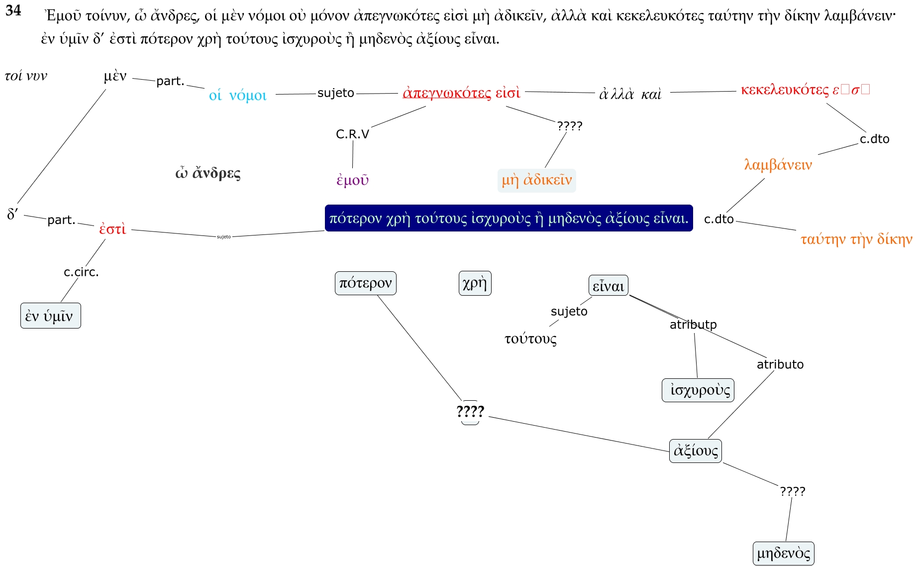 Este Cmap, tiene información relacionada con: Sin Título 1, ἐν ὑμῖν c.circ. ἐστὶ, μὲν ???? δ’, ἀξίους atributo εἶναι, μηδενὸς ???? ἀξίους, ἐμοῦ C.R.V ἀπεγνωκότες εἰσὶ, ἰσχυροὺς atributp εἶναι, μὴ ἀδικεῖν ???? ἀπεγνωκότες εἰσὶ, μὲν part. οἱ νόμοι, ταύτην τὴν δίκην c.dto λαμβάνειν, λαμβάνειν c.dto κεκελευκότες εἰσὶ, ἀξίους ???? ἢ, δ’ part. ἐστὶ, οἱ νόμοι sujeto ἀπεγνωκότες εἰσὶ, τούτους sujeto εἶναι, πότερον χρὴ τούτους ἰσχυροὺς ἢ μηδενὸς ἀξίους εἶναι. sujeto ἐστὶ, ἀλλὰ καὶ ???? ἀπεγνωκότες εἰσὶ, ἀλλὰ καὶ ???? κεκελευκότες εἰσὶ, πότερον ???? ????