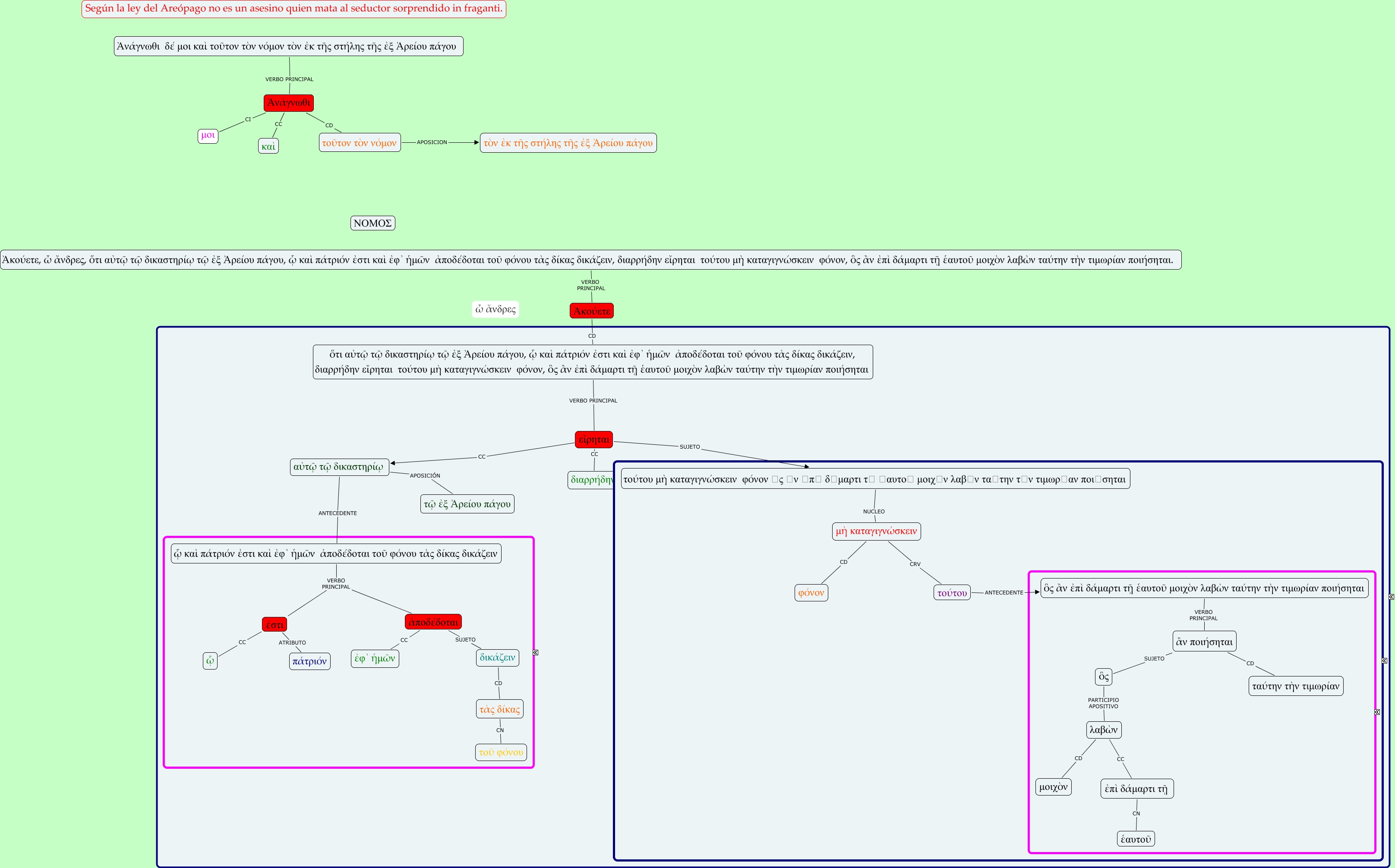 Este Cmap, tiene información relacionada con: Lisias I, 30_2002_22_01, αὐτῷ τῷ δικαστηρίῳ ANTECEDENTE ᾧ καὶ πάτριόν ἐστι καὶ ἐφ᾿ ἡμῶν ἀποδέδοται τοῦ φόνου τὰς δίκας δικάζειν, Ἀκούετε, ὦ ἄνδρες, ὅτι αὐτῷ τῷ δικαστηρίῳ τῷ ἐξ Ἀρείου πάγου, ᾧ καὶ πάτριόν ἐστι καὶ ἐφ᾿ ἡμῶν ἀποδέδοται τοῦ φόνου τὰς δίκας δικάζειν, διαρρήδην εἴρηται τούτου μὴ καταγιγνώσκειν φόνον, ὃς ἂν ἐπὶ δάμαρτι τῇ ἑαυτοῦ μοιχὸν λαβὼν ταύτην τὴν τιμωρίαν ποιήσηται. VERBO PRINCIPAL Ἀκούετε, εἴρηται SUJETO τούτου μὴ καταγιγνώσκειν φόνον ὃς ἂν ἐπὶ δάμαρτι τῇ ἑαυτοῦ μοιχὸν λαβὼν ταύτην τὴν τιμωρίαν ποιήσηται, Ἀνάγνωθι δέ μοι καὶ τοῦτον τὸν νόμον τὸν ἐκ τῆς στήλης τῆς ἐξ Ἀρείου πάγου VERBO PRINCIPAL Ἀνάγνωθι, τὰς δίκας CN τοῦ φόνου, ἐπὶ δάμαρτι τῇ CN ἑαυτοῦ, ἂν ποιήσηται SUJETO ὃς, εἴρηται CC διαρρήδην, δικάζειν CD τὰς δίκας, μὴ καταγιγνώσκειν CRV τούτου, τοῦτον τὸν νόμον APOSICION τὸν ἐκ τῆς στήλης τῆς ἐξ Ἀρείου πάγου, ᾧ καὶ πάτριόν ἐστι καὶ ἐφ᾿ ἡμῶν ἀποδέδοται τοῦ φόνου τὰς δίκας δικάζειν VERBO PRINCIPAL ἐστι, ἐστι CC ᾧ, ὃς ἂν ἐπὶ δάμαρτι τῇ ἑαυτοῦ μοιχὸν λαβὼν ταύτην τὴν τιμωρίαν ποιήσηται VERBO PRINCIPAL ἂν ποιήσηται, τούτου ANTECEDENTE ὃς ἂν ἐπὶ δάμαρτι τῇ ἑαυτοῦ μοιχὸν λαβὼν ταύτην τὴν τιμωρίαν ποιήσηται, Ἀνάγνωθι CC καὶ, Ἀνάγνωθι CI μοι, Ἀνάγνωθι CD τοῦτον τὸν νόμον, λαβὼν CD μοιχὸν, αὐτῷ τῷ δικαστηρίῳ APOSICIÓN τῷ ἐξ Ἀρείου πάγου