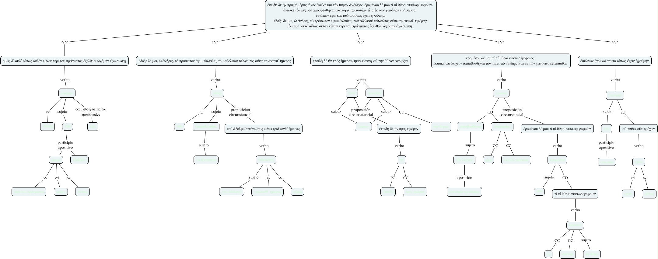 Este Cmap, tiene información relacionada con: Lisias I, 14_083006012009(alu), ἐπειδὴ δὲ ἦν πρὸς ἡμέραν verbo ἦν, ἐρομένου δέ μου τί αἱ θύραι νύκτωρ ψοφοῖεν verbo ἐρομένου, ἀνέῳξεν CD τὴν θύραν, ἐπειδὴ δὲ ἦν πρὸς ἡμέραν, ἧκεν ἐκείνη καὶ τὴν θύραν ἀνέῳξεν verbo ἀνέῳξεν, εγω participio apositivo εἰπὼν, ἦν CC πρὸς ἡμέραν, ἐπειδὴ δὲ ἦν πρὸς ἡμέραν, ἧκεν ἐκείνη καὶ τὴν θύραν ἀνέῳξεν. ἐρομένου δέ μου τί αἱ θύραι νύκτωρ ψοφοῖεν, ἔφασκε τὸν λύχνον ἀποσβεσθῆναι τὸν παρὰ τῷ παιδίῳ, εἶτα ἐκ τῶν γειτόνων ἐνάψασθαι. ἐσιώπων ἐγὼ καὶ ταῦτα οὕτως ἔχειν ἡγούμην. ἔδοξε δέ μοι, ὦ ἄνδρες, τὸ πρόσωπον ἐψιμυθιῶσθαι, τοῦ ἀδελφοῦ τεθνεῶτος οὔπω τριάκονθ᾿ ἡμέρας· ὅμως δ᾿ οὐδ᾿ οὕτως οὐδὲν εἰπὼν περὶ τοῦ πράγματος ἐξελθὼν ᾠχόμην ἔξω σιωπῇ. ???? ἐσιώπων ἐγὼ καὶ ταῦτα οὕτως ἔχειν ἡγούμην, τεθνεῶτος cc τριάκονθ᾿ ἡμέρας, εγω participio apositivo ἐξελθὼν, τεθνεῶτος sujeto τοῦ ἀδελφοῦ, ἐπειδὴ δὲ ἦν πρὸς ἡμέραν, ἧκεν ἐκείνη καὶ τὴν θύραν ἀνέῳξεν. ἐρομένου δέ μου τί αἱ θύραι νύκτωρ ψοφοῖεν, ἔφασκε τὸν λύχνον ἀποσβεσθῆναι τὸν παρὰ τῷ παιδίῳ, εἶτα ἐκ τῶν γειτόνων ἐνάψασθαι. ἐσιώπων ἐγὼ καὶ ταῦτα οὕτως ἔχειν ἡγούμην. ἔδοξε δέ μοι, ὦ ἄνδρες, τὸ πρόσωπον ἐψιμυθιῶσθαι, τοῦ ἀδελφοῦ τεθνεῶτος οὔπω τριάκονθ᾿ ἡμέρας· ὅμως δ᾿ οὐδ᾿ οὕτως οὐδὲν εἰπὼν περὶ τοῦ πράγματος ἐξελθὼν ᾠχόμην ἔξω σιωπῇ. ???? ἐπειδὴ δὲ ἦν πρὸς ἡμέραν, ἧκεν ἐκείνη καὶ τὴν θύραν ἀνέῳξεν, εἰπὼν cc οὕτως, ἀποσβεσθῆναι sujeto τὸν λύχνον, ὅμως δ᾿ οὐδ᾿ οὕτως οὐδὲν εἰπὼν περὶ τοῦ πράγματος ἐξελθὼν ᾠχόμην ἔξω σιωπῇ verbo ᾠχόμην, τοῦ ἀδελφοῦ τεθνεῶτος οὔπω τριάκονθ᾿ ἡμέρας verbo τεθνεῶτος, ἦν PC ἐπειδὴ, ἔδοξε CI μοι,, ἔδοξε δέ μοι, ὦ ἄνδρες, τὸ πρόσωπον ἐψιμυθιῶσθαι, τοῦ ἀδελφοῦ τεθνεῶτος οὔπω τριάκονθ᾿ ἡμέρας verbo ἔδοξε, ἧκεν proposición circunsatancial ἐπειδὴ δὲ ἦν πρὸς ἡμέραν, ἔχειν cc οὕτως