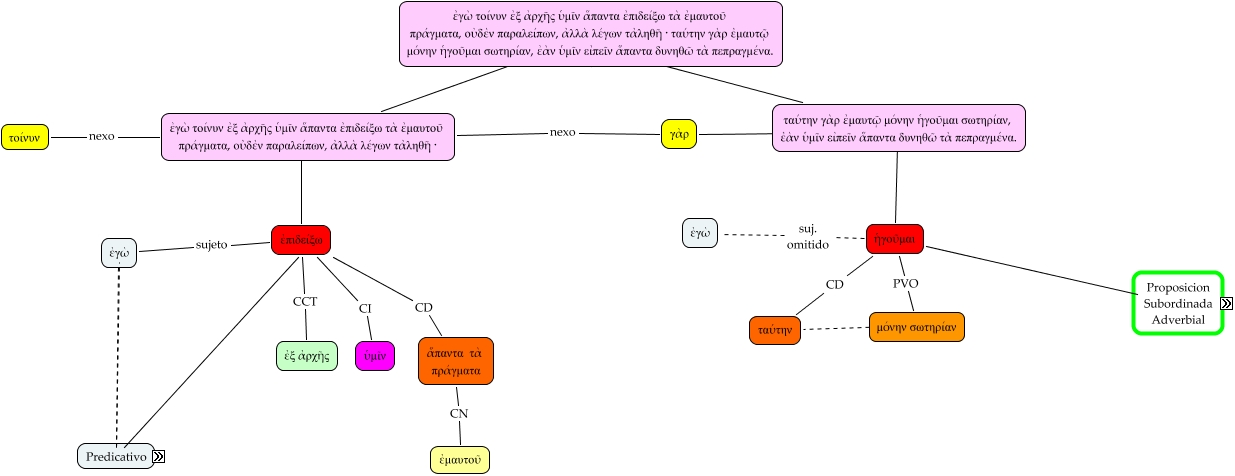 Este Cmap, tiene información relacionada con: Lisias I, 5 (corregido), λέγων PVO ἐπιδείξω, ὑμῖν CI εἰπεῖν, παραλείπων PVO ἐπιδείξω, ταύτην CD ἡγοῦμαι, τἀληθῆ CD λέγων, ταύτην γὰρ ἐμαυτῷ μόνην ἡγοῦμαι σωτηρίαν, ἐὰν ὑμῖν εἰπεῖν ἅπαντα δυνηθῶ τὰ πεπραγμένα. ???? ἐγὼ τοίνυν ἐξ ἀρχῆς ὑμῖν ἅπαντα ἐπιδείξω τὰ ἐμαυτοῦ πράγματα, οὐδὲν παραλείπων, ἀλλὰ λέγων τἀληθῆ · ταύτην γὰρ ἐμαυτῷ μόνην ἡγοῦμαι σωτηρίαν, ἐὰν ὑμῖν εἰπεῖν ἅπαντα δυνηθῶ τὰ πεπραγμένα., παραλείπων ???? ἐγὼ, ἡγοῦμαι ???? ταύτην γὰρ ἐμαυτῷ μόνην ἡγοῦμαι σωτηρίαν, ἐὰν ὑμῖν εἰπεῖν ἅπαντα δυνηθῶ τὰ πεπραγμένα., ἐὰν ὑμῖν εἰπεῖν ἅπαντα δυνηθῶ τὰ πεπραγμένα SUB. ADV. CONDICIONAL EVENTUAL ἡγοῦμαι, ἐξ ἀρχῆς CCT ἐπιδείξω, ἐπιδείξω ???? ἐγὼ τοίνυν ἐξ ἀρχῆς ὑμῖν ἅπαντα ἐπιδείξω τὰ ἐμαυτοῦ πράγματα, οὐδὲν παραλείπων, ἀλλὰ λέγων τἀληθῆ ·, γὰρ nexo ἐγὼ τοίνυν ἐξ ἀρχῆς ὑμῖν ἅπαντα ἐπιδείξω τὰ ἐμαυτοῦ πράγματα, οὐδὲν παραλείπων, ἀλλὰ λέγων τἀληθῆ ·, ἅπαντα τὰ πεπραγμένα CD εἰπεῖν, ἡγοῦμαι suj. omitido ἐγὼ, λέγων ???? ἐγὼ, οὐδὲν CD παραλείπων, ἐμαυτοῦ CN ἅπαντα τὰ πράγματα, ἐὰν nexo ἐὰν ὑμῖν εἰπεῖν ἅπαντα δυνηθῶ τὰ πεπραγμένα, μόνην σωτηρίαν PVO ἡγοῦμαι, εἰπεῖν CD δυνηθῶ