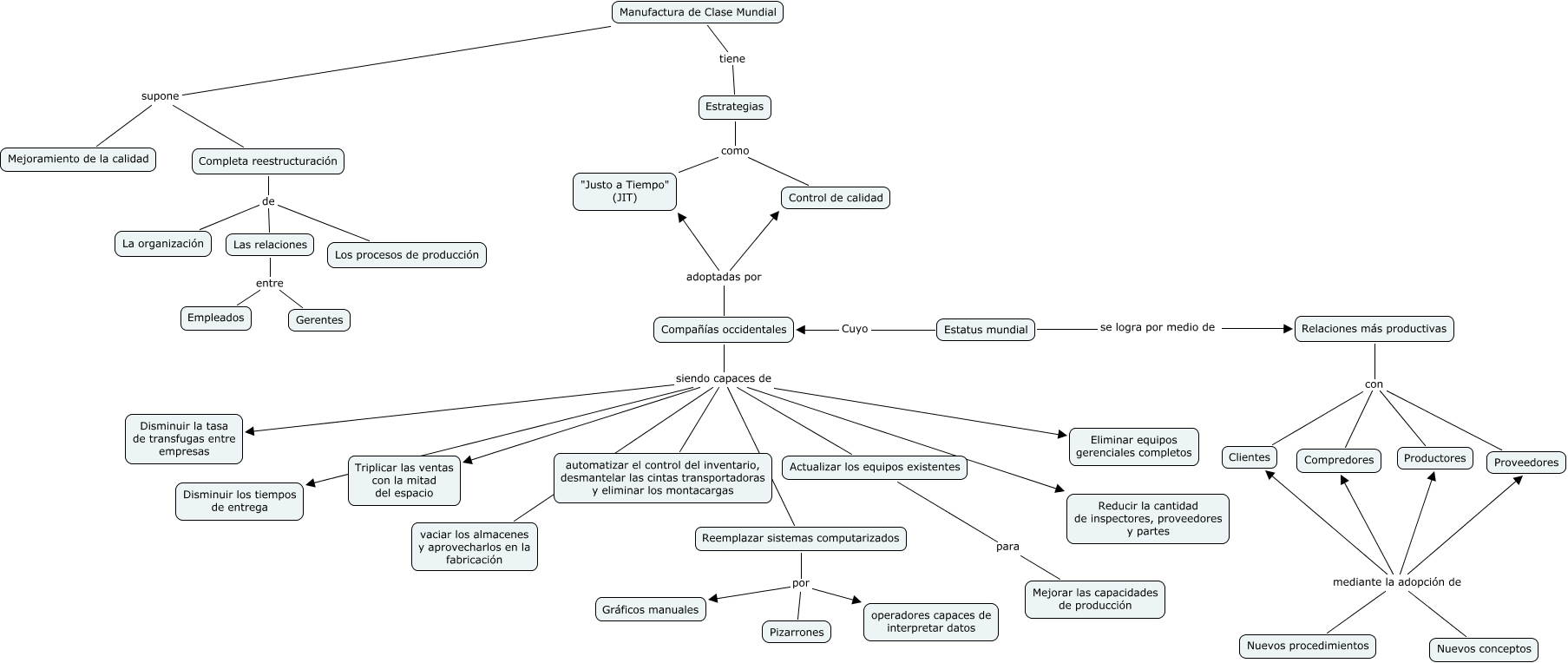 Este Cmap, tiene información relacionada con: Manufactura de Clase Mundial, Actualizar los equipos existentes para Mejorar las capacidades de producción, Relaciones más productivas con Proveedores, Compañías occidentales siendo capaces de Eliminar equipos gerenciales completos, Reemplazar sistemas computarizados por Gráficos manuales, Reemplazar sistemas computarizados por operadores capaces de interpretar datos, Nuevos procedimientos mediante la adopción de Proveedores, Reemplazar sistemas computarizados por Pizarrones, Estrategias como Control de calidad, Relaciones más productivas con Compredores, Nuevos procedimientos mediante la adopción de Compredores, Completa reestructuración de Los procesos de producción, Compañías occidentales siendo capaces de vaciar los almacenes y aprovecharlos en la fabricación, Compañías occidentales siendo capaces de Actualizar los equipos existentes, Nuevos procedimientos mediante la adopción de Clientes, Las relaciones entre Gerentes, Compañías occidentales siendo capaces de Triplicar las ventas con la mitad del espacio, Compañías occidentales siendo capaces de Disminuir los tiempos de entrega, Manufactura de Clase Mundial tiene Estrategias, Nuevos procedimientos mediante la adopción de Nuevos conceptos, Estatus mundial se logra por medio de Relaciones más productivas