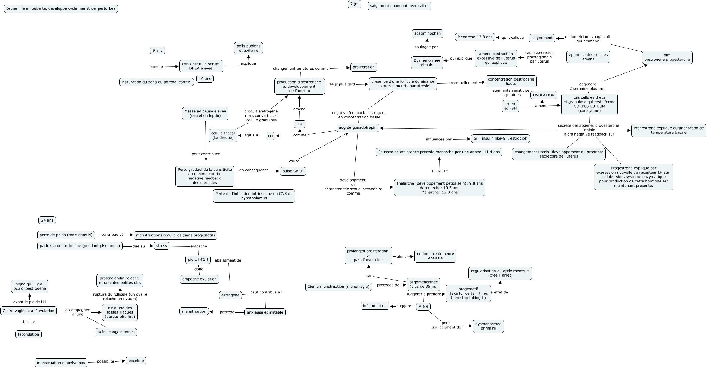 Cette carte conceptuelle, cree avec IHMC CmapTools, contient des informations liees a : app1-aller, Les cellules theca et granulosa qui reste forme CORPUS LUTEUM (corp jaune) degenere 2 semaine plus tard dim oestrogene progesterone, Poussee de croissance precede menarche par une annee: 11.4 ans influencee par GH, insulin like-GF, estrodiol), saignement qui explique Menarche:12.8 ans, presence d'une follicule dominante les autres meurts par atresie negative feedback oestrogene en concentration basse aug de gonadotropin, Perte graduel de la sensitivite du gonadostat du negative feedback des steroides en consequence pulse GnRH, LH PIC et FSH amene Les cellules theca et granulosa qui reste forme CORPUS LUTEUM (corp jaune), Maturation du zona du adrenal cortex amene concentration serum DHEA elevee, concentration serum DHEA elevee explique poils pubiens et axillaire, dlr a une des fosses iliaques (duree: plrs hrs) rupture du follicule (un ovaire relache un ovuum) prostaglandin relache et cree des petites dlrs, anxieuse et irritable precede menstruation, presence d'une follicule dominante les autres meurts par atresie eventuellement concentration oestrogene haute, pic LH-FSH donc empeche ovulation, dim oestrogene progesterone endometrium sloughs off qui ammene apoptose des cellules amene, oligomenorrhee (plus de 35 jrs) suggerer a prendre progestatif (take for certain time, then stop taking it), Dysmenorrhee primaire soulagee par acetiminophen, Glaire vaginale a l`ovulation accompagnee d`une dlr a une des fosses iliaques (duree: plrs hrs), FSH amene production d'oestrogene et developpement de l'antrum, Perte du l'inhibition intrinseque du CNS du hypothalamus en consequence pulse GnRH, AINS suggere inflammation, parfois amenorrheique (pendant plsrs mois) due au stress