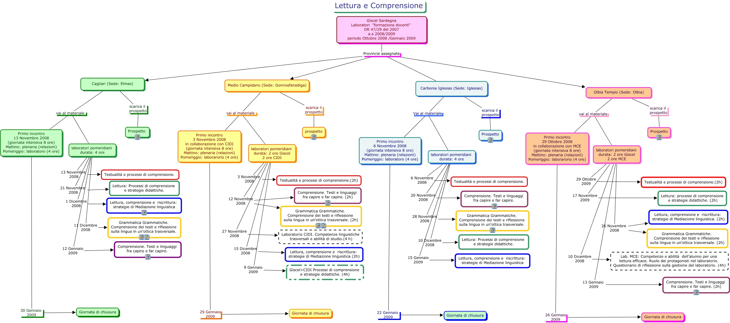 Questa Cmap, creata con IHMC CmapTools, contiene informazioni relative a: laboratori GiscelSardegna Del 47-29, laboratori pomeridiani durata: 2 ore Giscel 2 ore MCE 10 Dicembre 2008 Lab. MCE: Competenze e abilità dell’alunno per una lettura efficace. Ruolo dei protagonisti nel laboratorio. Questionario di riflessione sulla gestione del laboratorio. (4h), laboratori pomeridiani durata: 2 ore Giscel 2 ore CIDI 27 Novembre 2008 Laboratorio CIDI. Competenze linguistiche trasversali e abilità di studio.(4 h), laboratori pomeridiani durata: 4 ore 15 Gennaio 2009 Lettura, comprensione e riscrittura: strategie di Mediazione linguistica, laboratori pomeridiani durata: 4 ore 20 Novembre 2008 Comprensione. Testi e linguaggi fra capire e far capire., laboratori pomeridiani durata: 4 ore 21 Novembre 2008 Lettura: Processi di comprensione e strategie didattiche., Cagliari (Sede: Elmas) scarica il prospetto Prospetto, laboratori pomeridiani durata: 2 ore Giscel 2 ore CIDI 12 Novembre 2008 Grammatica Grammatiche. Comprensione dei testi e riflessione sulla lingua in un'ottica trasversale. (2h), Giscel Sardegna Laboratori "formazione docenti" DR 47/29 del 2007 a.s 2008/2009 periodo Ottobre 2008 /Gennaio 2009 Provincie assegnate Olbia Tempio (Sede: Olbia), Primo incontro 6 Novembre 2008 (giornata intensiva 8 ore) Mattino: plenaria (relazioni) Pomeriggio: laboratoro (4 ore) 22 Gennaio 2009 Giornata di chiusura, laboratori pomeridiani durata: 2 ore Giscel 2 ore CIDI 12 Novembre 2008 Comprensione. Testi e linguaggi fra capire e far capire. (2h), Olbia Tempio (Sede: Olbia) scarica il prospetto Prospetto, Cagliari (Sede: Elmas) vai al materiale laboratori pomeridiani durata: 4 ore, laboratori pomeridiani durata: 4 ore 11 Dicembre 2008 Grammatica Grammatiche. Comprensione dei testi e riflessione sulla lingua in un'ottica trasversale., Carbonia Iglesias (Sede: Iglesias) scarica il prospetto Prospetto, laboratori pomeridiani durata: 4 ore 13 Novembre 2008 Testualità e processi di comprensione., Medio Campidano (Sede: Gonnosfanadiga) scarica il prospetto prospetto, laboratori pomeridiani durata: 2 ore Giscel 2 ore MCE 17 Novembre 2009 Lettura: processi di comprensione e strategie didattiche. (2h), Olbia Tempio (Sede: Olbia) vai al materiale Primo incontro 29 Ottobre 2008 in collaborazione con MCE (giornata intensiva 8 ore) Mattino: plenaria (relazioni) Pomeriggio: laborarorio (4 ore), Cagliari (Sede: Elmas) vai al materiale Primo incontro 13 Novembre 2008 (giornata intensiva 8 ore) Mattino: plenaria (relazioni) Pomeriggio: laboratoro (4 ore), Giscel Sardegna Laboratori "formazione docenti" DR 47/29 del 2007 a.s 2008/2009 periodo Ottobre 2008 /Gennaio 2009 Provincie assegnate Carbonia Iglesias (Sede: Iglesias)