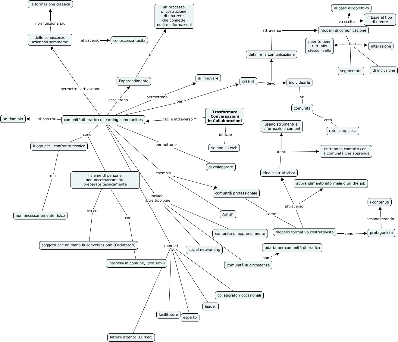 Questa Cmap, creata con IHMC CmapTools, contiene informazioni relative a: SocialNetworking24_2, comunità di pratica o learning communities membri collaboratori occasionali, individuarla se comunità, comunità di pratica o learning communities permettono di innovare, idea costruttivista utenti usano strumenti e informazioni comuni, comunità professionale come modello formativo costruttivista, comunità creo rete complessa, modello formativo costruttivista attraverso idea costruttivista, modelli di comunicazione va scelta in base all'obiettivo, delle conoscenze aziendali sommerse non funziona più la formazione classica, idea costruttivista utenti entrano in contatto con la comunità che apprende, comunità di pratica o learning communities membri leader, comunità di pratica o learning communities sono luogo per i confronto tecnico, comunità di pratica o learning communities esempio Amish, modelli di comunicazione di tipo di inclusione, modelli di comunicazione di tipo interazione, comunità di pratica o learning communities membri lettore attento (Lurker), comunità di pratica o learning communities include altre tipologie comunità di apprendimento, modelli di comunicazione va scelta in base al tipo di utente, comunità di pratica o learning communities permette l'attivazione delle conoscenze aziendali sommerse, modelli di comunicazione di tipo peer to peer tutti allo stesso livello
