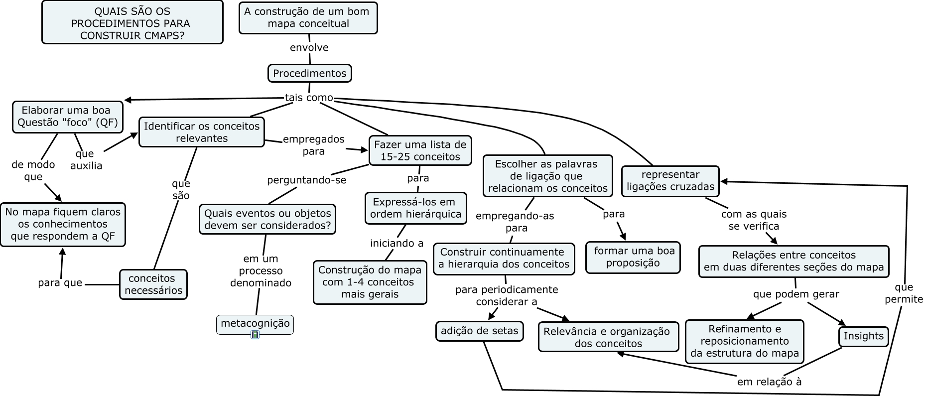 Esse mapa conceitual, produzido no IHMC CmapTools, tem a informação relacionada a: PROCEDIMENTOS II, Construir continuamente a hierarquia dos conceitos para periodicamente considerar a Relevância e organização dos conceitos, representar ligações cruzadas com as quais se verifica Relações entre conceitos em duas diferentes seções do mapa, Relações entre conceitos em duas diferentes seções do mapa que podem gerar Insights, Relações entre conceitos em duas diferentes seções do mapa que podem gerar Refinamento e reposicionamento da estrutura do mapa, Insights em relação à Relevância e organização dos conceitos, Fazer uma lista de 15-25 conceitos perguntando-se Quais eventos ou objetos devem ser considerados?, conceitos necessários para que No mapa fiquem claros os conhecimentos que respondem a QF, Procedimentos tais como representar ligações cruzadas, Procedimentos tais como Fazer uma lista de 15-25 conceitos, Escolher as palavras de ligação que relacionam os conceitos empregando-as para Construir continuamente a hierarquia dos conceitos, Escolher as palavras de ligação que relacionam os conceitos para formar uma boa proposição, Procedimentos tais como Identificar os conceitos relevantes, Identificar os conceitos relevantes que são conceitos necessários, Fazer uma lista de 15-25 conceitos para Expressá-los em ordem hierárquica, Elaborar uma boa Questão "foco" (QF) de modo que No mapa fiquem claros os conhecimentos que respondem a QF, Elaborar uma boa Questão "foco" (QF) que auxilia Identificar os conceitos relevantes, Construir continuamente a hierarquia dos conceitos para periodicamente considerar a adição de setas, Expressá-los em ordem hierárquica iniciando a Construção do mapa com 1-4 conceitos mais gerais, Quais eventos ou objetos devem ser considerados? em um processo denominado metacognição, Identificar os conceitos relevantes empregados para Fazer uma lista de 15-25 conceitos