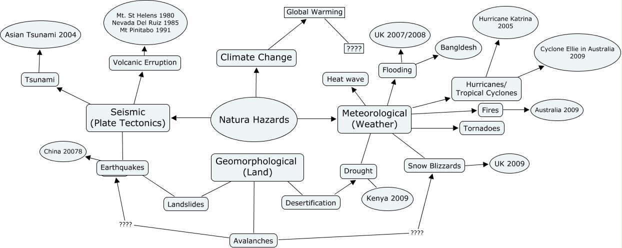 This Concept Map, created with IHMC CmapTools, has information related to: Natual Hazards, Global Warming ???? ????, Tsunami ???? Asian Tsunami 2004, Hurricanes/ Tropical Cyclones ???? Hurricane Katrina 2005, Seismic (Plate Tectonics) ???? Volcanic Erruption, Meteorological (Weather) ???? Hurricanes/ Tropical Cyclones, Flooding ???? Bangldesh, Meteorological (Weather) ???? Drought, Avalanches ???? ????, Seismic (Plate Tectonics) ???? Tsunami, Volcanic Erruption ???? Mt. St Helens 1980 Nevada Del Ruiz 1985 Mt Pinitabo 1991, Meteorological (Weather) ???? Fires, Natura Hazards ???? Meteorological (Weather), Earthquakes ???? Landslides, Geomorphological (Land) ???? Landslides, Natura Hazards ???? Climate Change, Natura Hazards ???? Seismic (Plate Tectonics), Fires ???? Australia 2009, Flooding ???? UK 2007/2008, Meteorological (Weather) ???? Tornadoes, Meteorological (Weather) ???? Heat wave
