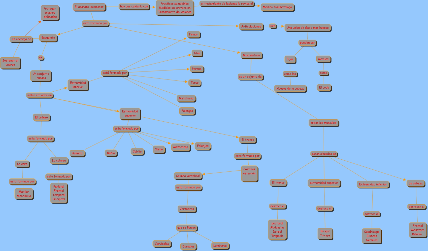 Este Cmap, tiene información relacionada con: CONO-T02-El aparato locomotor, Fijas como los Huesos de la cabeza, La cara esta formada por Maxilar Mandibula, Estremidad superior esta formado por Humero, Articulaciones son Una union de dos o mas huesos, El aparato locomotor esta formado por Musculatura, Estremidad inferior está formada por Perone, El cráneo esta formado por La cara, El aparato locomotor esta formado por Articulaciones, extremidad superior destaca el Biceps Triceps, Esqueleto se encarga de Proteger organos delicados, todos los musculos estan situados en extremidad superior, Moviles como El codo, Un conjunto huesos estan situados en El tronco, El aparato locomotor esta formado por Esqueleto, Estremidad superior esta formado por Carpo, Una union de dos o mas huesos pueden ser Moviles, Estremidad inferior está formada por Tarso, todos los musculos estan situados en El tronco, Practicas saludables Medidas de prevencion Tratamiento de lesiones el tratamiento de lesiones lo revisa el Medico traumatologo, Estremidad inferior está formada por Femur