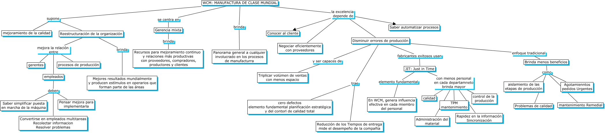 Este Cmap, tiene información relacionada con: Manufactura de Clase Mundial, Reestructuración de la organización mejora la relación entre empleados, empleados deben Convertirse en empleados multitareas Recolectar informacion Resolver problemas, WCM: MANUFACTURA DE CLASE MUNDIAL brinda Panorama general a cualquier involucrado en los procesos de manufacturra, Disminuir errores de producción trae Reducción de los Tiempos de entrega mide el desempeño de la compañía, Disminuir errores de producción trae cero defectos elemento fundamental planificación estratégica y del contorl de calidad total, JIT: Just in Time con menos personal en cada departamneto brinda mayor Administración del material, JIT: Just in Time con menos personal en cada departamneto brinda mayor control de la producción, JIT: Just in Time elemento fundamental En WCM, genera influencia efectiva en cada miembro del personal, Reestructuración de la organización brinda Mejores resultados mundialmente y producen estímulos en operarios que forman parte de las áreas, Brinda menos beneficios como aislamiento de las etapas de producción, JIT: Just in Time con menos personal en cada departamneto brinda mayor Rapidez en la información Sincronización, JIT: Just in Time con menos personal en cada departamneto brinda mayor TPM mantenimiento, Disminuir errores de producción enfoque tradicional Brinda menos beneficios, Reestructuración de la organización mejora la relación entre procesos de producción, JIT: Just in Time con menos personal en cada departamneto brinda mayor calidad, Gerencia mixta brinda Recursos para mejoramiento continuo y relaciones más productivas con proveedores, compradores, productores y clientes, WCM: MANUFACTURA DE CLASE MUNDIAL la excelencia depende de Saber automatizar procesos, WCM: MANUFACTURA DE CLASE MUNDIAL la excelencia depende de Conocer al cliente, Brinda menos beneficios como Problemas de calidad, Brinda menos beneficios como mantenimiento Remedial