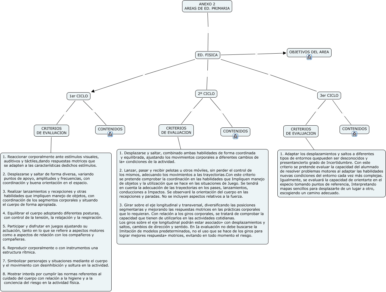 Este Cmap, tiene información relacionada con: ed fisica anexo2, CRITERIOS DE EVALUACION 1. Reaccionar corporalmente ante estímulos visuales, auditivos y táctiles,dando respuestas motrices que se adapten a las características dedichos estímulos. 2. Desplazarse y saltar de forma diversa, variando puntos de apoyo, amplitudes y frecuencias, con coordinación y buena orientación en el espacio. 3. Realizar lanzamientos y recepciones y otras habilidades que impliquen manejo de objetos, con coordinación de los segmentos corporales y situando el cuerpo de forma apropiada. 4. Equilibrar el cuerpo adoptando diferentes posturas, con control de la tensión, la relajación y la respiración. 5. Participar y disfrutar en juegos ajustando su actuación, tanto en lo que se refiere a aspectos motores como a aspectos de relación con los compañeros y compañeras. 6. Reproducir corporalmente o con instrumentos una estructura rítmica. 7. Simbolizar personajes y situaciones mediante el cuerpo y el movimiento con desinhibición y soltura en la actividad. 8. Mostrar interés por cumplir las normas referentes al cuidado del cuerpo con relación a la higiene y a la conciencia del riesgo en la actividad física., 2º CICLO CRITERIOS DE EVALUACION, CRITERIOS DE EVALUACION ???? 1. Desplazarse y saltar, combinado ambas habilidades de forma coordinada y equilibrada, ajustando los movimientos corporales a diferentes cambios de la» condiciones de la actividad. 2. Lanzar, pasar y recibir pelotas u otros móviles, sin perder el control de los mismos, adecuando tos movimientos a las trayectorias.Con este criterio se pretende comprobar la coordinación en las habilidades que Impliquen manejo de objetos y la utilización que se hace en las situaciones de Juego. Se tendrá en cuenta la adecuación de las trayectorias en los pases, lanzamientos, conducciones a Impactos. Se observaré la orientación del cuerpo en las recepciones y paradas. No se incluyen aspectos relativos a la fuerza. 3. Girar sobre el eje longitudinal y transversal, diversificando las posiciones segmentarias y mejorando las respuestas motrices en las prácticas corporales que lo requieran. Con relación a los giros corporales, se tratará de comprobar la capacidad que tienen de utilizarlos en las actividades cotidianas. Los giros sobre el eje longitudinal podrán estar asociado» con desplazamientos y saltos, cambios de dirección y sentido. En Ia evaluación no debe buscarse la Imitación de modelos predeterminados, no el uso que se hace de los giros para lograr mejores respuesta» motrices, evitando en todo momento el riesgo., 1er CICLO CONTENIDOS, 1er CICLO CRITERIOS DE EVALUACION, 2º CICLO CONTENIDOS, 3er CICLO CRITERIOS DE EVALUACION, ED. FISICA 1er CICLO, ED. FISICA 3er CICLO, 3er CICLO CONTENIDOS, ANEXO 2 AREAS DE ED. PRIMARIA ED. FISICA, CRITERIOS DE EVALUACION ???? 1. Adaptar los desplazamientos y saltos a diferentes tipos de entornos quepueden ser desconocidos y presentancierto grado de Incertidumbre. Con este criterio se pretende evaluar la capacidad del alumnado de resolver problemas motores al adaptar las habilidades nuevas condiciones del entorno cada vez más complejas. Igualmente, se evaluará la capacidad de orientarte en el especio tomando puntos de referencia, Interpretando mapas sencillos para desplazarte de un lugar a otro, escogiendo un camino adecuado., ED. FISICA OBJETIVOS DEL AREA, ED. FISICA 2º CICLO