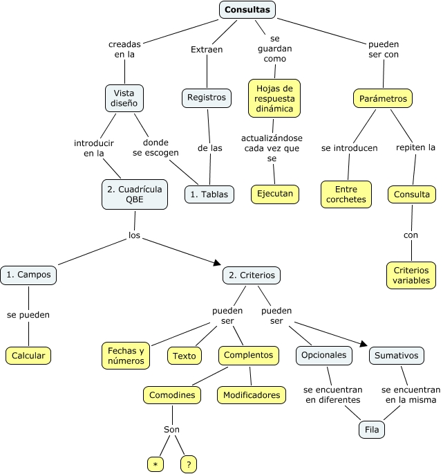 Este Cmap, tiene información relacionada con: Consultas, 2. Criterios pueden ser Complentos, 2. Criterios pueden ser Sumativos, Vista diseño introducir en la 2. Cuadrícula QBE, Hojas de respuesta dinámica actualizándose cada vez que se Ejecutan, Parámetros se introducen Entre corchetes, Consultas pueden ser con Parámetros, 2. Criterios pueden ser Fechas y números, Complentos Comodines, Opcionales se encuentran en diferentes Fila, Consultas Extraen Registros, Consulta con Criterios variables, Complentos Modificadores, 1. Campos se pueden Calcular, Consultas creadas en la Vista diseño, Comodines Son ?, 2. Criterios pueden ser Opcionales, Parámetros repiten la Consulta, Sumativos se encuentran en la misma Fila, Vista diseño donde se escogen 1. Tablas, Comodines Son *