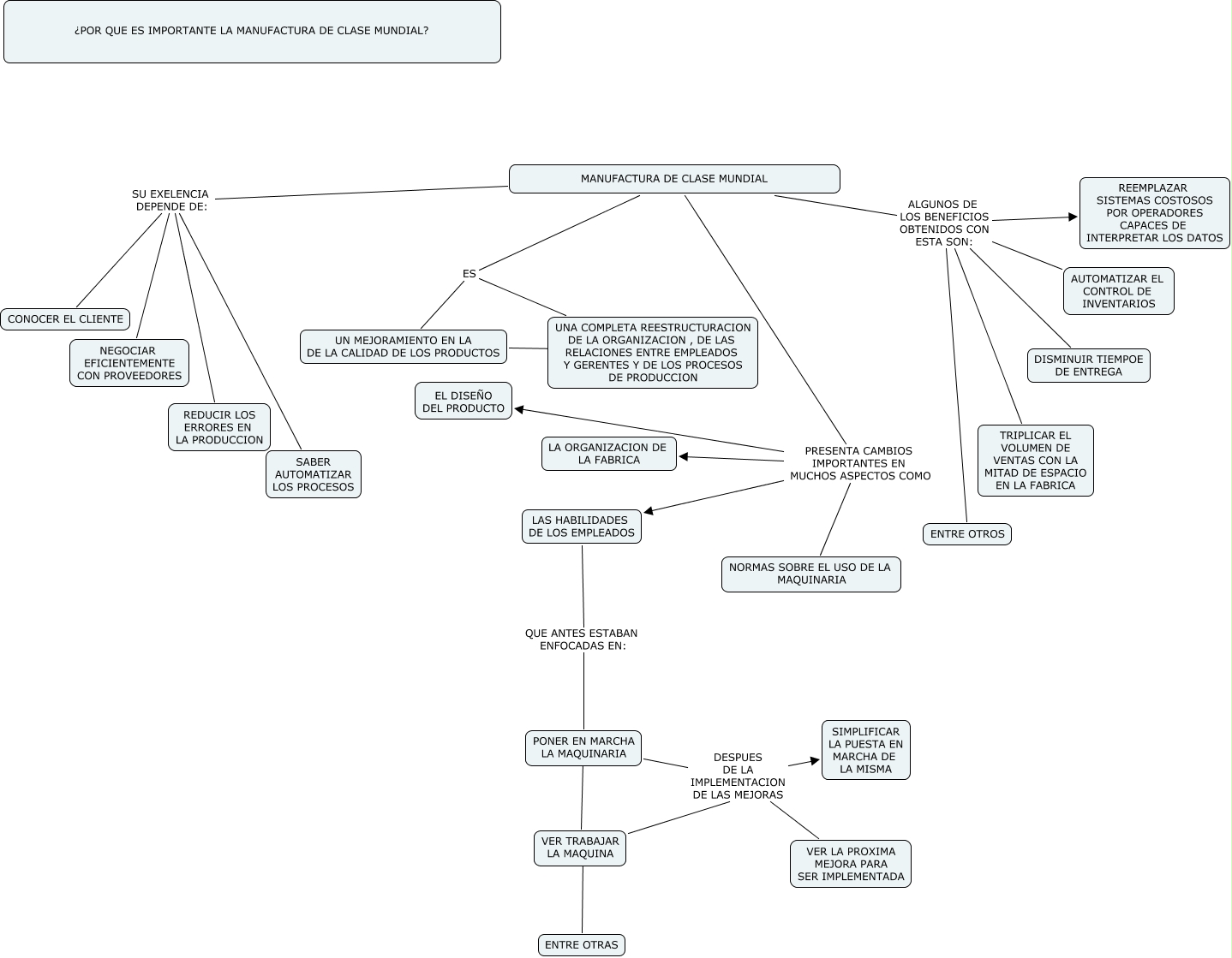 Este Cmap, tiene información relacionada con: MANUFACTURA CLASE MUNDIAL, MANUFACTURA DE CLASE MUNDIAL ES UNA COMPLETA REESTRUCTURACION DE LA ORGANIZACION , DE LAS RELACIONES ENTRE EMPLEADOS Y GERENTES Y DE LOS PROCESOS DE PRODUCCION, LAS HABILIDADES DE LOS EMPLEADOS QUE ANTES ESTABAN ENFOCADAS EN: PONER EN MARCHA LA MAQUINARIA, PONER EN MARCHA LA MAQUINARIA ???? VER TRABAJAR LA MAQUINA, MANUFACTURA DE CLASE MUNDIAL SU EXELENCIA DEPENDE DE: SABER AUTOMATIZAR LOS PROCESOS, PONER EN MARCHA LA MAQUINARIA DESPUES DE LA IMPLEMENTACION DE LAS MEJORAS SIMPLIFICAR LA PUESTA EN MARCHA DE LA MISMA, VER TRABAJAR LA MAQUINA ???? ENTRE OTRAS, MANUFACTURA DE CLASE MUNDIAL PRESENTA CAMBIOS IMPORTANTES EN MUCHOS ASPECTOS COMO EL DISEÑO DEL PRODUCTO, MANUFACTURA DE CLASE MUNDIAL ALGUNOS DE LOS BENEFICIOS OBTENIDOS CON ESTA SON: DISMINUIR TIEMPOE DE ENTREGA, MANUFACTURA DE CLASE MUNDIAL PRESENTA CAMBIOS IMPORTANTES EN MUCHOS ASPECTOS COMO NORMAS SOBRE EL USO DE LA MAQUINARIA, MANUFACTURA DE CLASE MUNDIAL PRESENTA CAMBIOS IMPORTANTES EN MUCHOS ASPECTOS COMO LA ORGANIZACION DE LA FABRICA, MANUFACTURA DE CLASE MUNDIAL SU EXELENCIA DEPENDE DE: REDUCIR LOS ERRORES EN LA PRODUCCION, UN MEJORAMIENTO EN LA DE LA CALIDAD DE LOS PRODUCTOS Y UNA COMPLETA REESTRUCTURACION DE LA ORGANIZACION , DE LAS RELACIONES ENTRE EMPLEADOS Y GERENTES Y DE LOS PROCESOS DE PRODUCCION, VER TRABAJAR LA MAQUINA DESPUES DE LA IMPLEMENTACION DE LAS MEJORAS SIMPLIFICAR LA PUESTA EN MARCHA DE LA MISMA, MANUFACTURA DE CLASE MUNDIAL PRESENTA CAMBIOS IMPORTANTES EN MUCHOS ASPECTOS COMO LAS HABILIDADES DE LOS EMPLEADOS, PONER EN MARCHA LA MAQUINARIA DESPUES DE LA IMPLEMENTACION DE LAS MEJORAS VER LA PROXIMA MEJORA PARA SER IMPLEMENTADA, MANUFACTURA DE CLASE MUNDIAL ES UN MEJORAMIENTO EN LA DE LA CALIDAD DE LOS PRODUCTOS, MANUFACTURA DE CLASE MUNDIAL ALGUNOS DE LOS BENEFICIOS OBTENIDOS CON ESTA SON: TRIPLICAR EL VOLUMEN DE VENTAS CON LA MITAD DE ESPACIO EN LA FABRICA, MANUFACTURA DE CLASE MUNDIAL ALGUNOS DE LOS BENEFICIOS OBTENIDOS CON ESTA SON: ENTRE OTROS, MANUFACTURA DE CLASE MUNDIAL ALGUNOS DE LOS BENEFICIOS OBTENIDOS CON ESTA SON: AUTOMATIZAR EL CONTROL DE INVENTARIOS, MANUFACTURA DE CLASE MUNDIAL ALGUNOS DE LOS BENEFICIOS OBTENIDOS CON ESTA SON: REEMPLAZAR SISTEMAS COSTOSOS POR OPERADORES CAPACES DE INTERPRETAR LOS DATOS